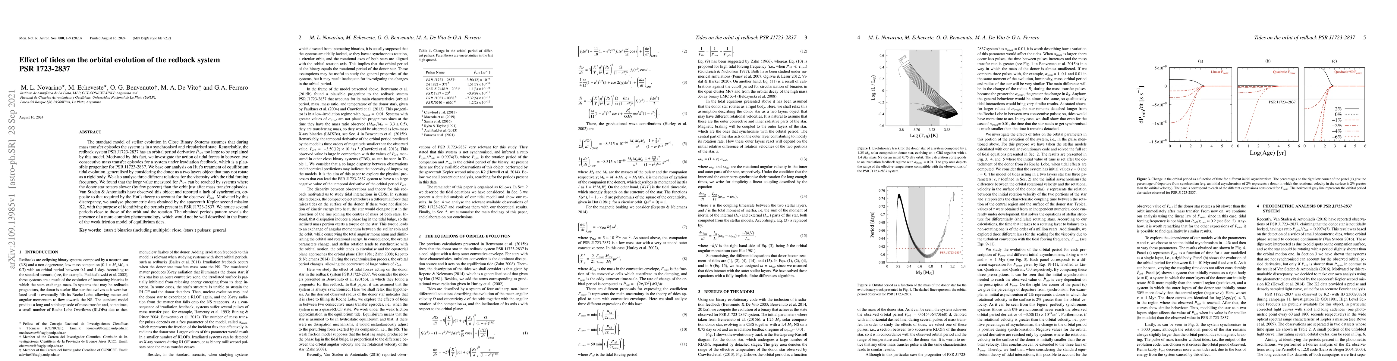 The standard model of stellar evolution in Close Binary Systems assumes that during mass transfer episodes the system is in a synchronised and circularised state. Remarkably, the redback system PSR J1723-2837 has an orbital period derivative $\dot{P}_{orb}$ too large to be explained by this model. Motivated by this fact, we investigate the action of tidal forces in between two consecutive mass transfer episodes for a system under irradiation feedback, which is a plausible progenitor for PSR J1723-2837. We base our analysis on Hut's treatment of equilibrium tidal evolution, generalised by considering the donor as a two layers object that may not rotate as a rigid body. We also analyse three different relations for the viscosity with the tidal forcing frequency. We found that the large value measured for $\dot{P}_{orb}$ can be reached by systems where the donor star rotates slower (by few percent) than the orbit just after mass transfer episodes. Van Staden & Antoniadis have observed this object and reported a lack of synchronism, opposite to that required by the Hut's theory to account for the observed $\dot{P}_{orb}$. Motivated by this discrepancy, we analyse photometric data obtained by the spacecraft Kepler second mission K2, with the purpose of identifying the periods present in PSR J1723-2837. We notice several periods close to those of the orbit and the rotation. The obtained periods pattern reveals the presence of a more complex phenomenology, which would not be well described in the frame of the weak friction model of equilibrium tides.