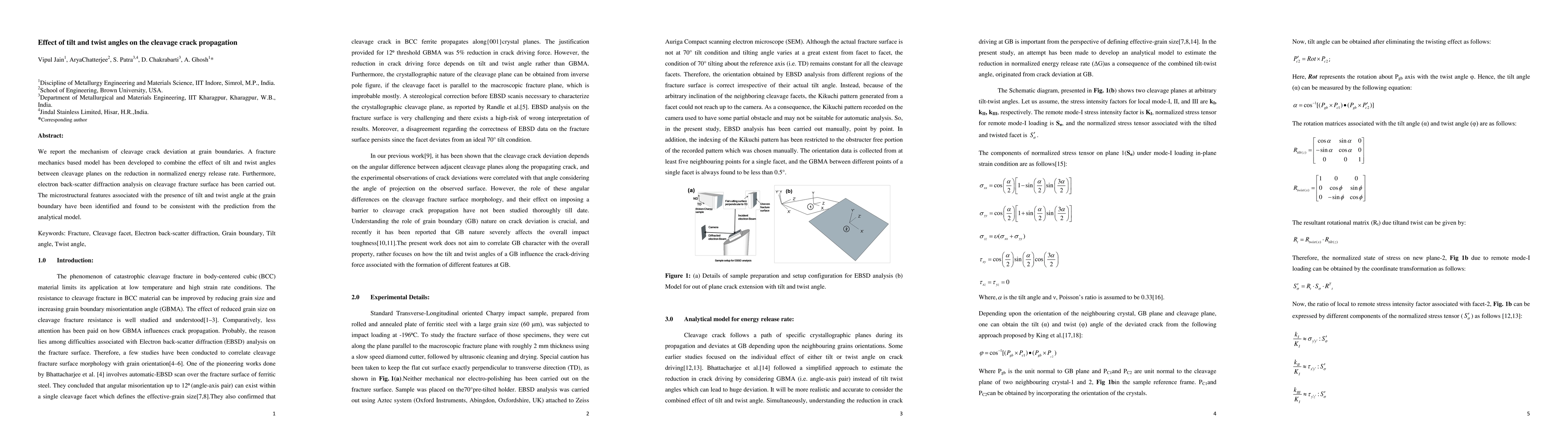 This study develops a fracture mechanics model to analyze how tilt and twist angles between cleavage planes affect crack propagation, finding that these angles reduce the normalized energy release rate. Electron back-scatter diffraction analysis confirms the microstructural features predicted by the model.