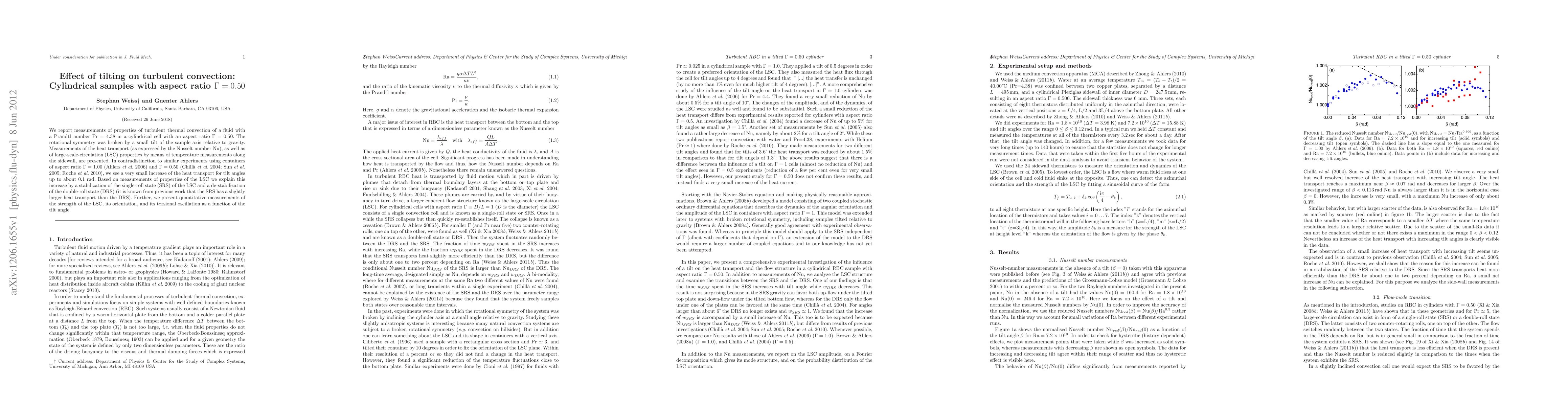 We report measurements of properties of turbulent thermal convection of a fluid with a Prandtl number $\Pra=4.38$ in a cylindrical cell with an aspect ratio $\Gamma=0.50$. The rotational symmetry was broken by a small tilt of the sample axis relative to gravity. Measurements of the heat transport (as expressed by the Nusselt number \Nu), as well as of large-scale-circulation (LSC) properties by means of temperature measurements along the sidewall, are presented. In contradistinction to similar experiments using containers of aspect ratio $\Gamma=1.00$ \cite[]{ABN06} and $\Gamma=0.50$ \cite[]{CRCC04,SXX05,RGKS10}, we see a very small increase of the heat transport for tilt angles up to about 0.1 rad. Based on measurements of properties of the LSC we explain this increase by a stabilization of the single-roll state (SRS) of the LSC and a de-stabilization of the double-roll state (DRS) (it is known from previous work that the SRS has a slightly larger heat transport than the DRS). Further, we present quantitative measurements of the strength of the LSC, its orientation, and its torsional oscillation as a function of the tilt angle.