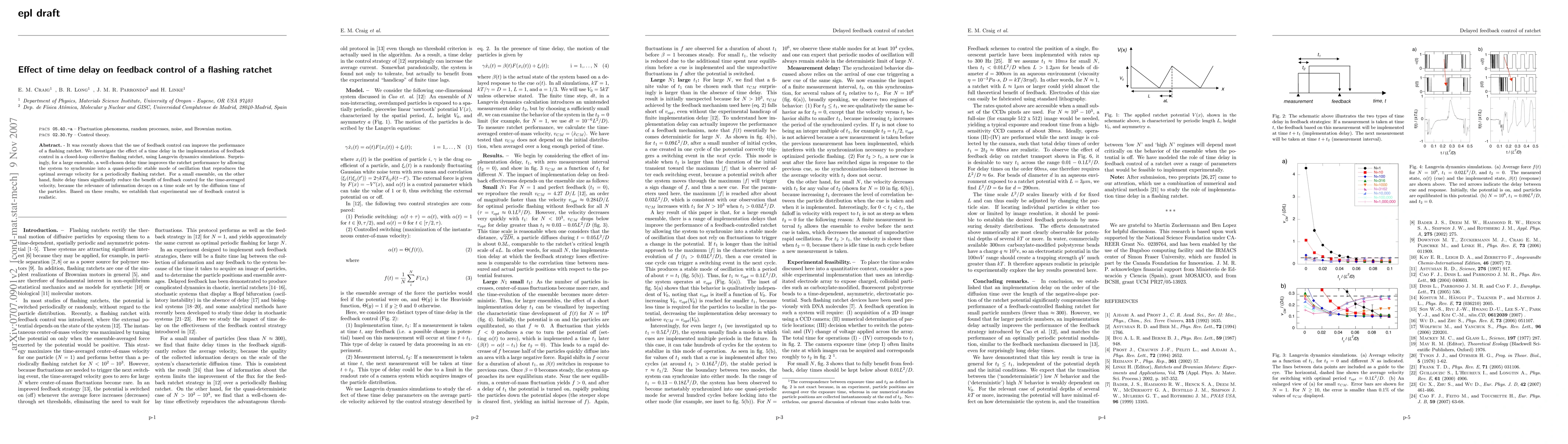 This study investigates how time delay in feedback control affects the performance of a collective flashing ratchet, revealing that an optimal delay can enhance performance in large ensembles by enabling synchronization into a stable oscillation mode. Conversely, small ensembles suffer performance loss due to information decay, suggesting practical feasibility for feedback control in experiments.