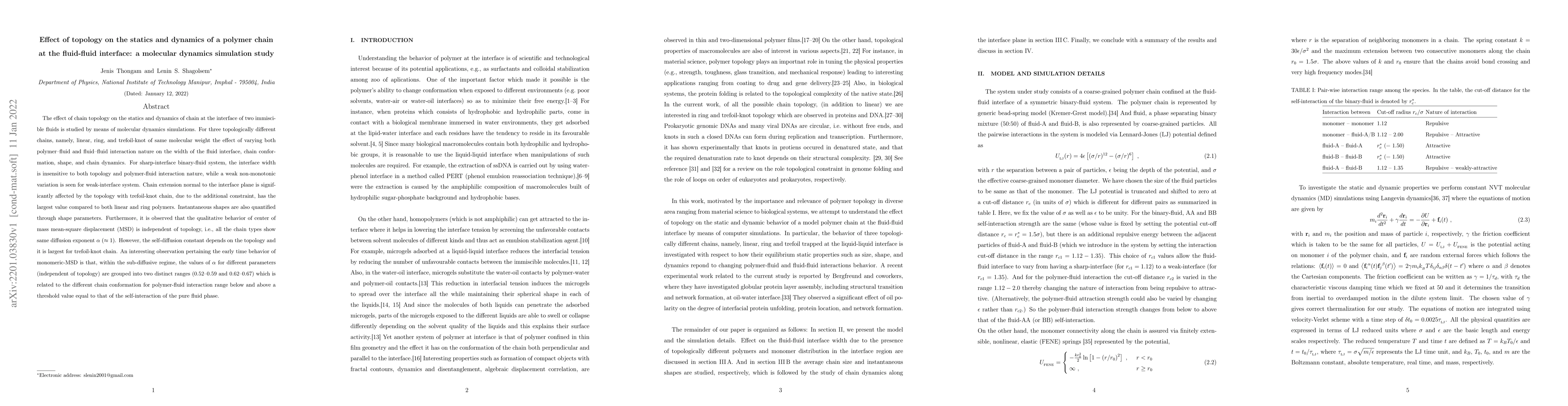 The effect of chain topology on the statics and dynamics of chain at the interface of two immiscible fluids is studied by means of molecular dynamics simulations. For three topologically different chains, namely, linear, ring, and trefoil-knot of same molecular weight the effect of varying both polymer--fluid and fluid--fluid interaction nature on the width of the fluid interface, chain conformation, shape, and chain dynamics. For sharp-interface binary-fluid system, the interface width is insensitive to both topology and polymer-fluid interaction nature, while a weak non-monotonic variation is seen for weak-interface system. Chain extension normal to the interface plane is significantly affected by the topology with trefoil-knot chain, due to the additional constraint, has the largest value compared to both linear and ring polymers. Instantaneous shapes are also quantified through shape parameters. Furthermore, it is observed that the qualitative behavior of center of mass mean-square displacement (MSD) is independent of topology, i.e., all the chain types show same diffusion exponent $\alpha~(\approx 1)$. However, the self-diffusion constant depends on the topology and it is largest for trefoil-knot chain. An interesting observation pertaining the early time behavior of monomeric-MSD is that, within the sub-diffusive regime, the values of $\alpha$ for different parameters (independent of topology) are grouped into two distinct ranges (0.52--0.59 and 0.62--0.67) which is related to the different chain conformation for polymer-fluid interaction range below and above a threshold value equal to that of the self-interaction of the pure fluid phase.
