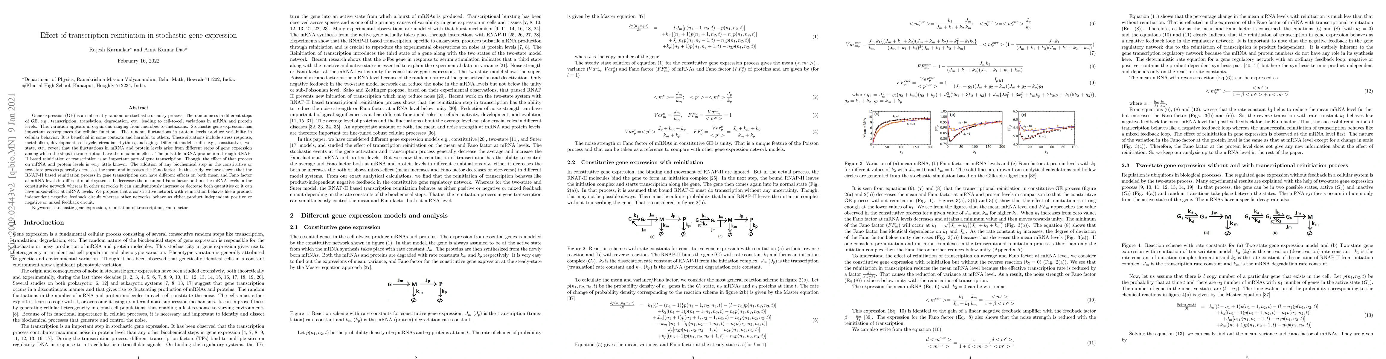 Gene expression (GE) is an inherently random or stochastic or noisy process. The randomness in different steps of GE, e.g., transcription, translation, degradation, etc., leading to cell-to-cell variations in mRNA and protein levels. This variation appears in organisms ranging from microbes to metazoans. Stochastic gene expression has important consequences for cellular function. The random fluctuations in protein levels produce variability in cellular behavior. It is beneficial in some contexts and harmful to others. These situations include stress response, metabolism, development, cell cycle, circadian rhythms, and aging. Different model studies e.g., constitutive, two-state, etc., reveal that the fluctuations in mRNA and protein levels arise from different steps of gene expression among which the steps in transcription have the maximum effect. The pulsatile mRNA production through RNAP-II based reinitiation of transcription is an important part of gene transcription. Though, the effect of that process on mRNA and protein levels is very little known. The addition of any biochemical step in the constitutive or two-state process generally decreases the mean and increases the Fano factor. In this study, we have shown that the RNAP-II based reinitiation process in gene transcription can have different effects on both mean and Fano factor at mRNA levels in different model systems. It decreases the mean and Fano factor both at the mRNA levels in the constitutive network whereas in other networks it can simultaneously increase or decrease both quantities or it can have mixed-effect at mRNA levels. We propose that a constitutive network with reinitiation behaves like a product independent negative feedback circuit whereas other networks behave as either product independent positive or negative or mixed feedback circuit.