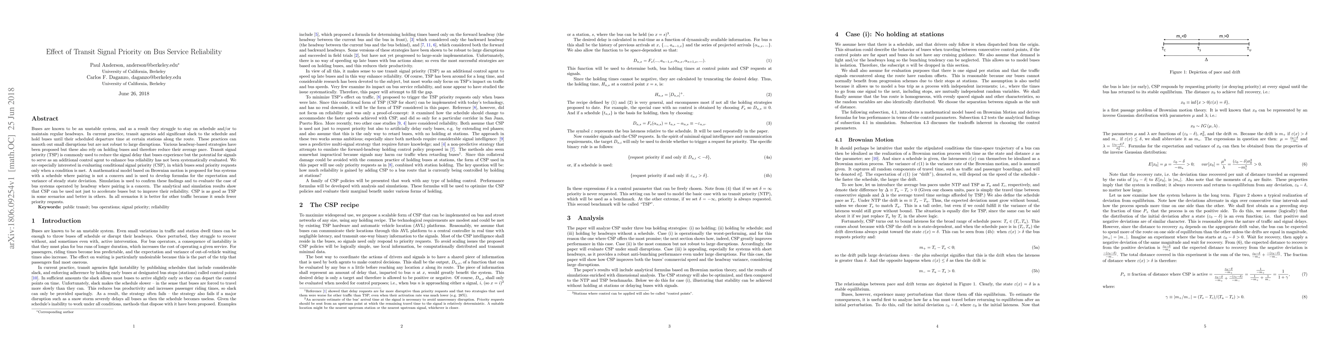 Buses are known to be an unstable system, and as a result they struggle to stay on schedule and/or to maintain regular headways. In current practice, transit agencies add significant slack to the schedule and hold buses until their scheduled departure time at certain stations along the route. These practices can smooth out small disruptions but are not robust to large disruptions. Various headway-based strategies have been proposed but these also rely on holding buses and therefore reduce their average pace. Transit signal priority (TSP) is commonly used to reduce the signal delay that buses experience but the potential for signals to serve as an additional control agent to enhance bus reliability has not been systematically evaluated. We are especially interested in evaluating conditional signal priority (CSP), in which buses send priority requests only when a condition is met. A mathematical model based on Brownian motion is proposed for bus systems with a schedule where pairing is not a concern and is used to develop formulas for the expectation and variance of steady state deviation. Simulation is used to confirm these findings and to evaluate the case of bus systems operated by headway where pairing is a concern. The analytical and simulation results show that CSP can be used not just to accelerate buses but to improve their reliability. CSP is as good as TSP in some scenarios and better in others. In all scenarios it is better for other traffic because it sends fewer priority requests.