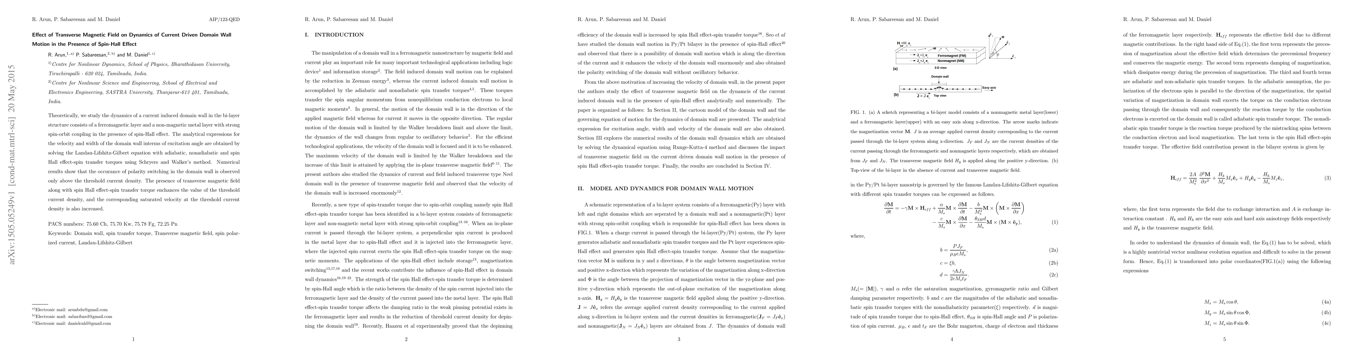 Theoretically, we study the dynamics of a current induced domain wall in the bi-layer structure consists of a ferromagnetic layer and a non-magnetic metal layer with strong spin-orbit coupling in the presence of spin-Hall effect. The analytical expressions for the velocity and width of the domain wall interms of excitation angle are obtained by solving the Landau-Lifshitz-Gilbert equation with adiabatic, nonadiabatic and spin Hall effect-spin transfer torques using Schryers and Walker's method. Numerical results show that the occurance of polarity switching in the domain wall is observed only above the threshold current density. The presence of transverse magnetic field along with spin Hall effect-spin transfer torque enchances the value of the threshold current density, and the corresponding saturated velocity at the threshold current density is also increased.