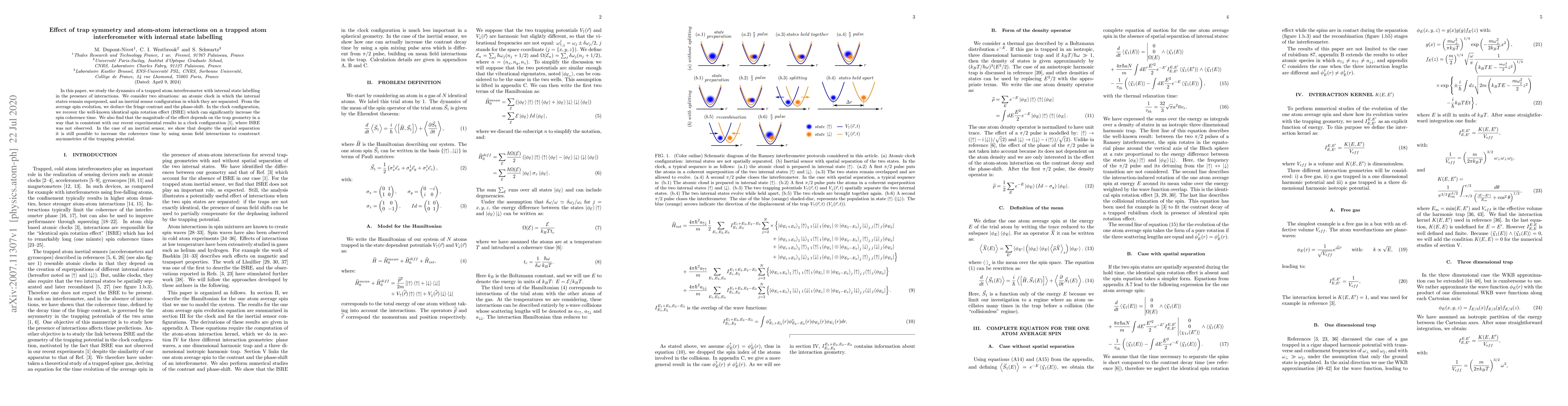 This paper investigates the dynamics of a trapped atom interferometer with internal state labelling, focusing on the effects of trap symmetry and atom-atom interactions. It reveals that the identical spin rotation effect can significantly enhance spin coherence time in atomic clock configurations, while mean field interactions can mitigate trap asymmetries to improve coherence in inertial sensor setups.