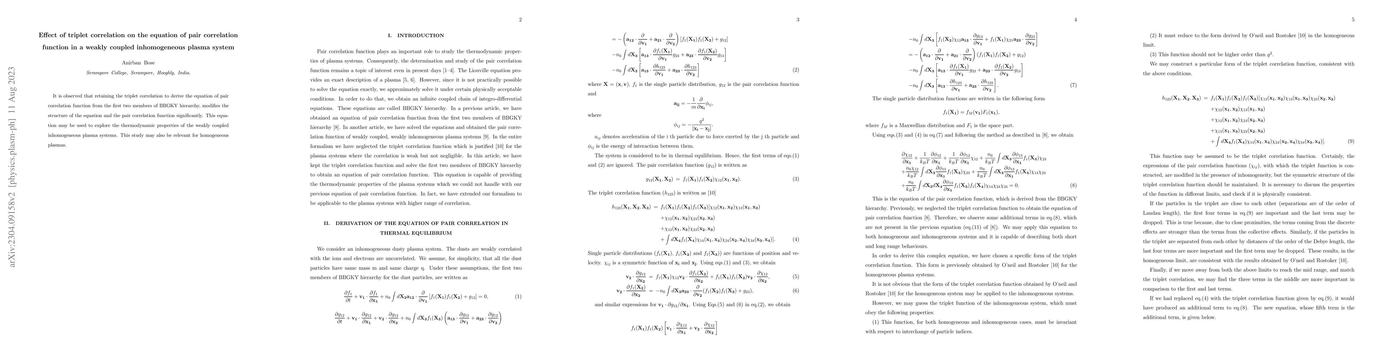 Summary: The inclusion of triplet correlation in deriving the equation of pair correlation function alters its structure and the function itself, providing a new tool for studying thermodynamic properties of weakly coupled inhomogeneous plasma systems, with potential implications for homogeneous plasmas as well.