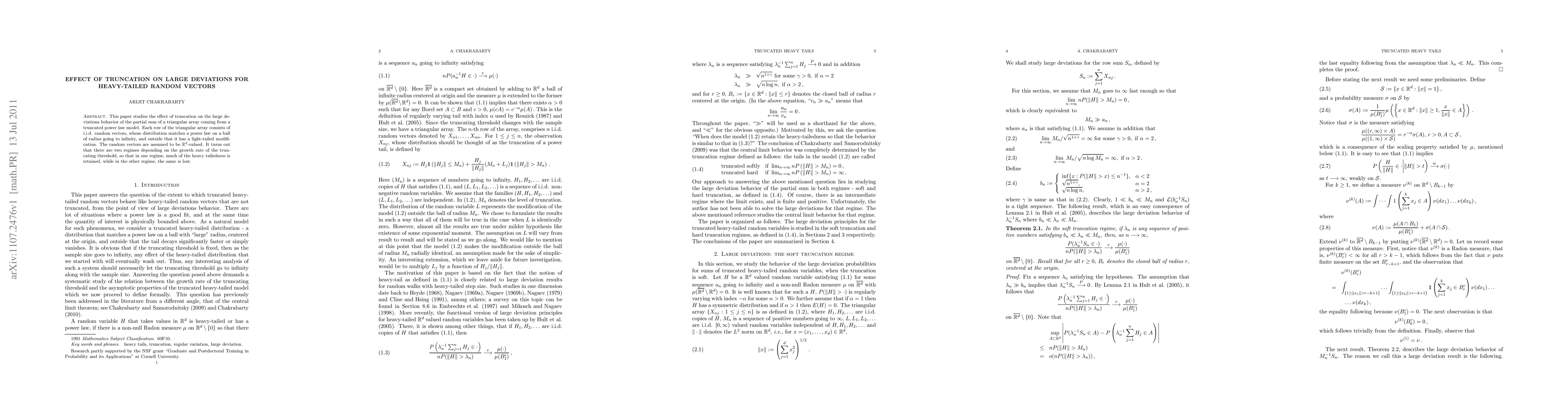 This paper examines how truncation affects large deviations for heavy-tailed random vectors in a triangular array, revealing two regimes based on the truncating threshold's growth rate: one retains heavy-tailedness, while the other loses it.