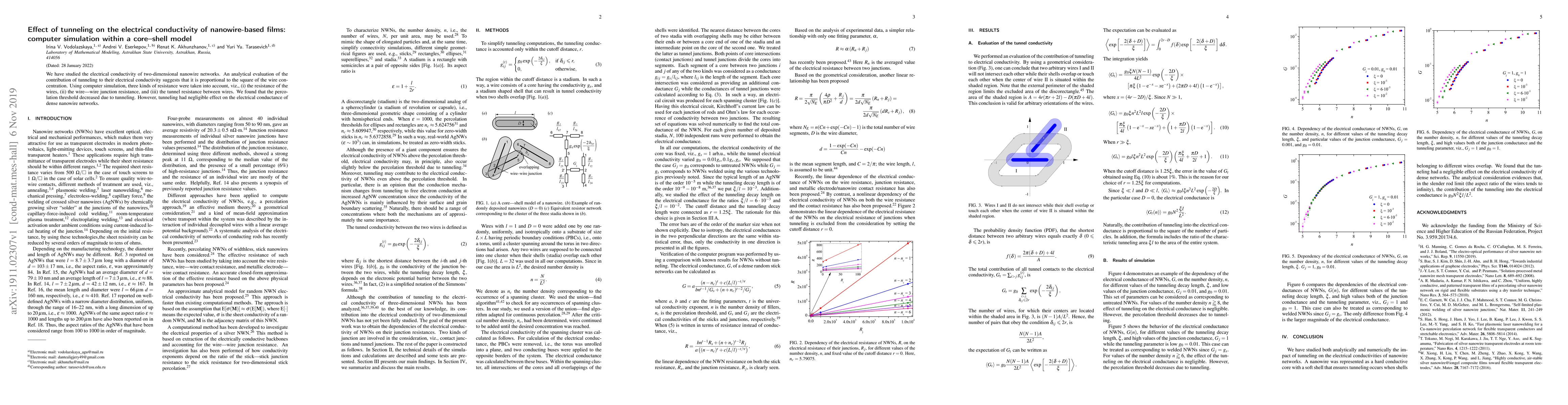 This paper investigates the electrical conductivity of two-dimensional nanowire networks, finding that tunneling contributes significantly to conductivity, proportional to the square of wire concentration. The study reveals that tunneling lowers the percolation threshold but has a negligible effect on dense networks.