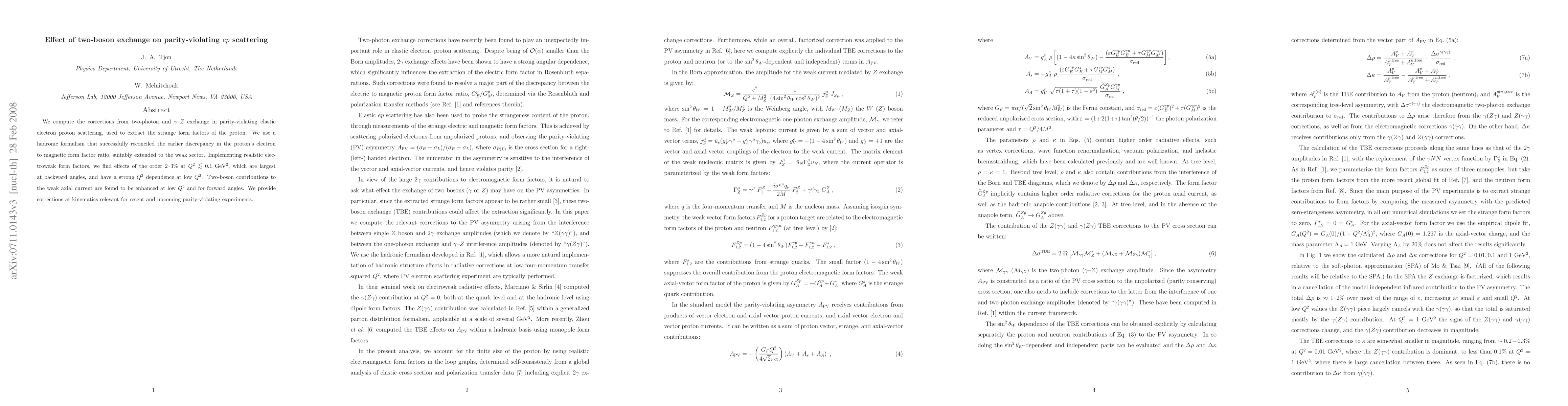 This paper calculates corrections from two-photon and photon-Z exchange in parity-violating electron-proton scattering, finding effects of 2-3% at low Q^2, which are significant at backward angles and have strong Q^2 dependence. It also enhances two-boson contributions to the weak axial current at low Q^2 and forward angles.