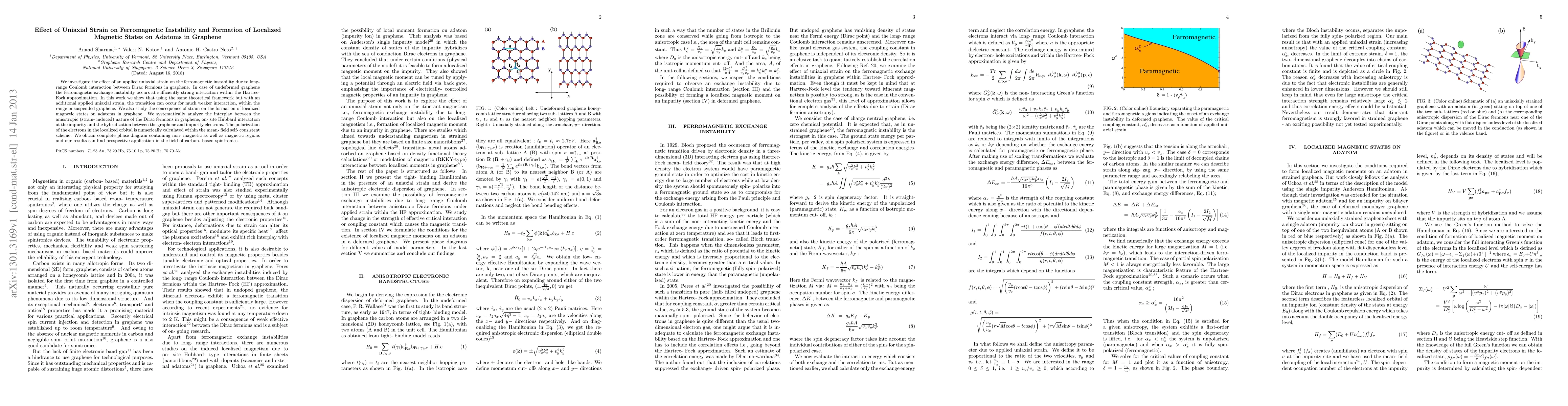 This study explores how uniaxial strain influences ferromagnetic instability in graphene due to long-range Coulomb interactions among Dirac fermions, revealing that strain can trigger this transition at weaker interactions. It also examines the impact of strain on localized magnetic states in adatoms, providing a detailed phase diagram for potential applications in carbon-based spintronics.