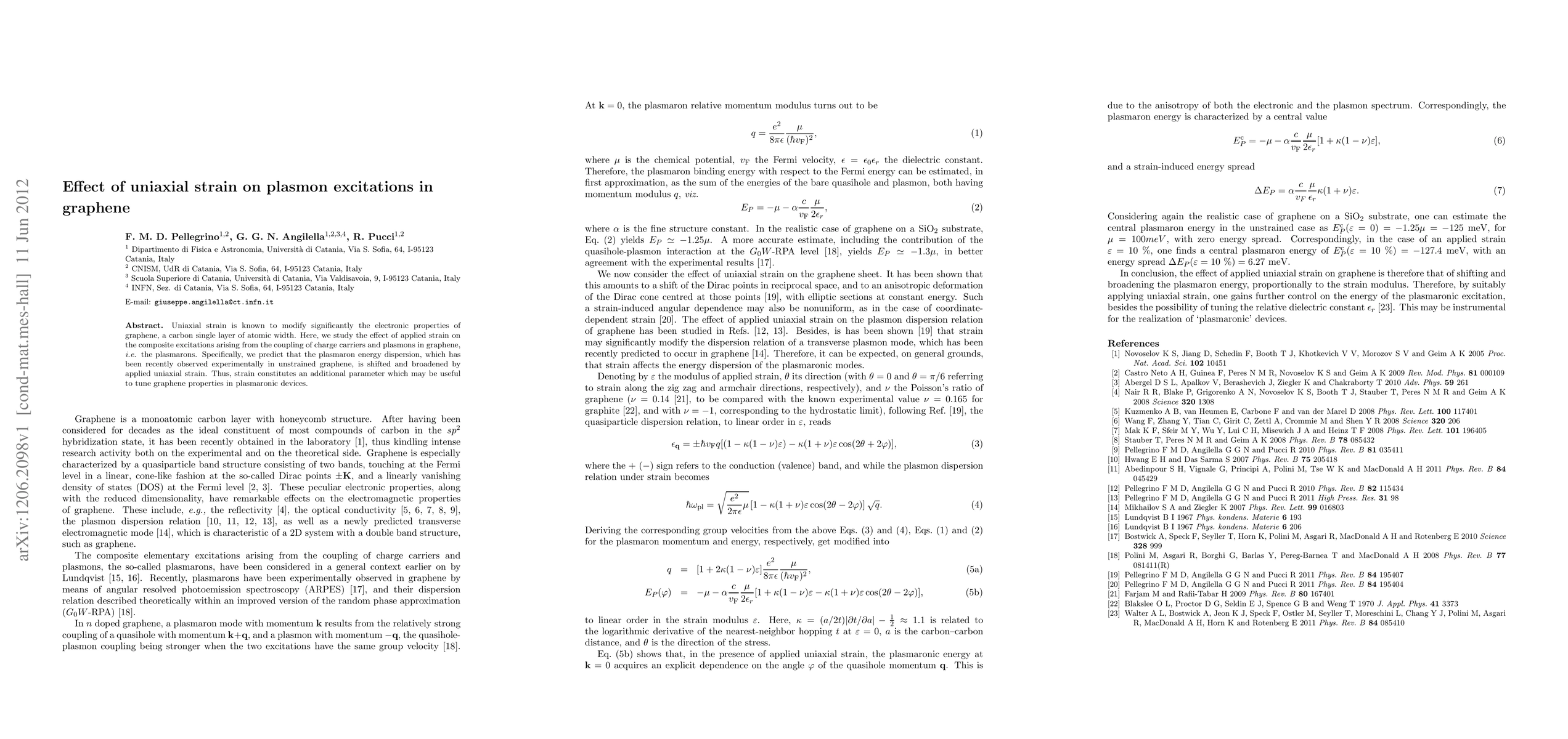 This study investigates how uniaxial strain alters the energy dispersion of plasmarons in graphene, showing that strain shifts and broadens these composite excitations, potentially offering a tunable parameter for plasmaronic devices.