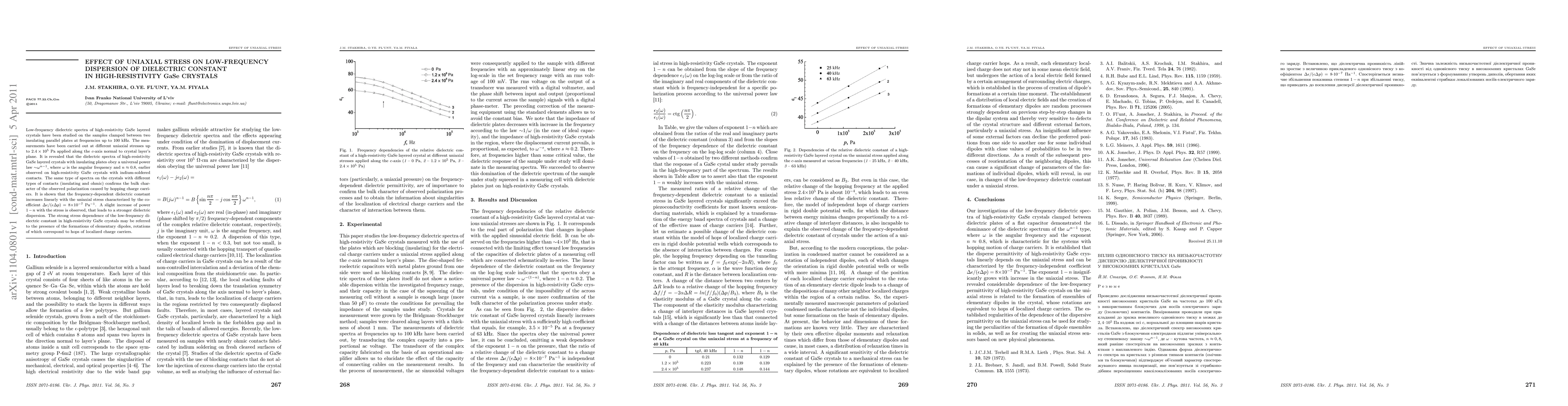 This study investigates the low-frequency dielectric spectra of high-resistivity GaSe crystals under uniaxial stress, revealing a universal power law dependence on frequency. The dielectric constant increases linearly with applied stress, indicating the bulk character of polarization due to hopping charge carriers.