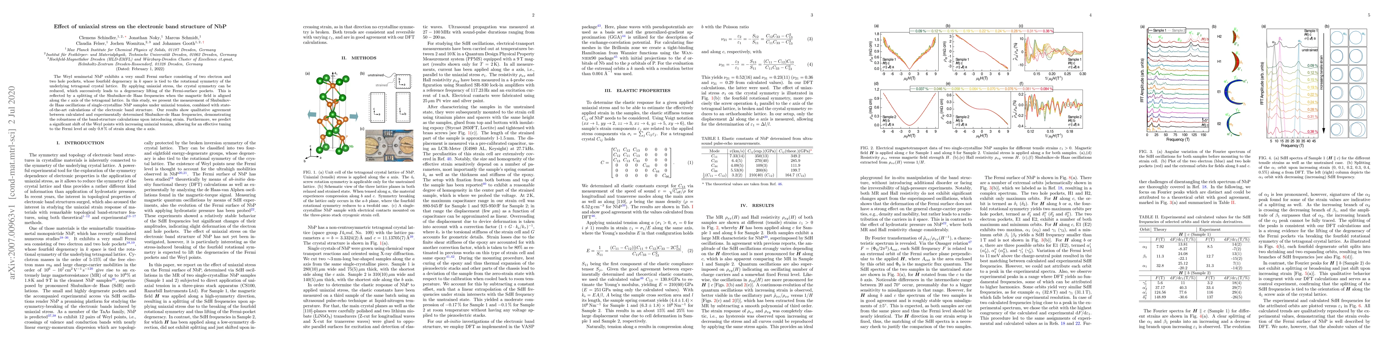The Weyl semimetal NbP exhibits a very small Fermi surface consisting of two electron and two hole pockets, whose fourfold degeneracy in $k$ space is tied to the rotational symmetry of the underlying tetragonal crystal lattice. By applying uniaxial stress, the crystal symmetry can be reduced, which successively leads to a degeneracy lifting of the Fermi-surface pockets. This is reflected by a splitting of the Shubnikov-de Haas frequencies when the magnetic field is aligned along the $c$ axis of the tetragonal lattice. In this study, we present the measurement of Shubnikov-de Haas oscillations of single-crystalline NbP samples under uniaxial tension, combined with state-of-the-art calculations of the electronic band structure. Our results show qualitative agreement between calculated and experimentally determined Shubnikov-de Haas frequencies, demonstrating the robustness of the band-structure calculations upon introducing strain. Furthermore, we predict a significant shift of the Weyl points with increasing uniaxial tension, allowing for an effective tuning to the Fermi level at only 0.8% of strain along the $a$ axis.