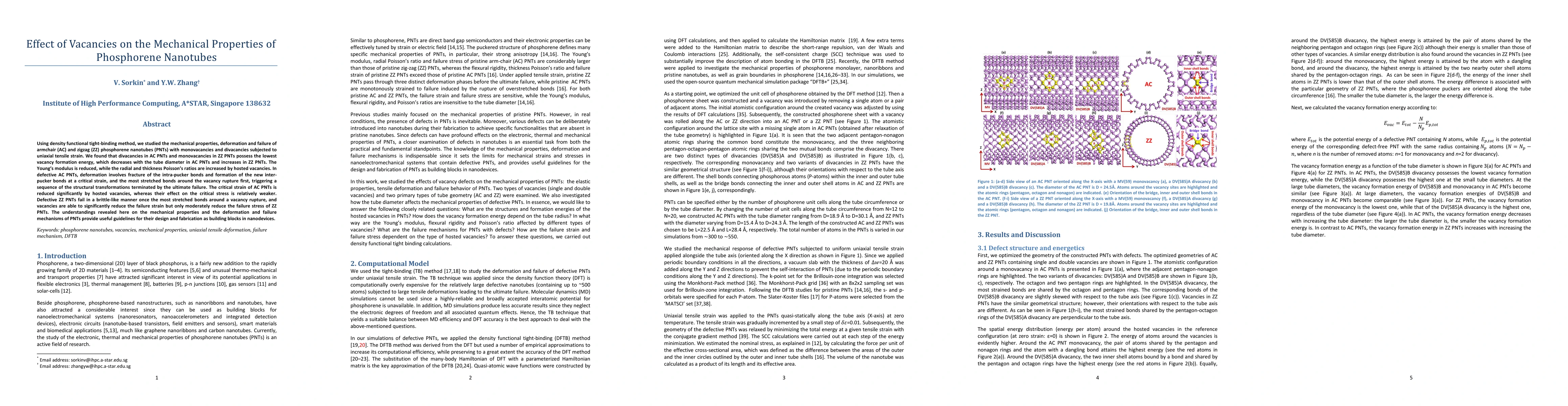 Summary: This study employs density functional tight-binding to investigate how monovacancies and divacancies affect the mechanical properties, deformation, and failure behavior of armchair and zigzag phosphorene nanotubes under uniaxial tensile strain. The findings reveal significant differences in the structural stability and mechanical response between the two types of phosphorene nanotubes.