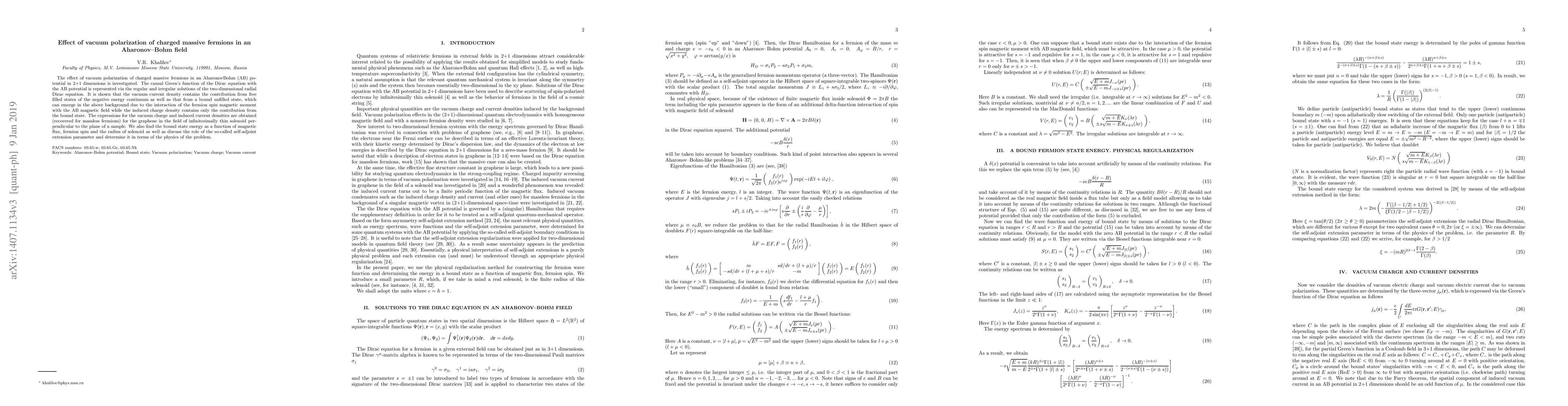 This paper investigates vacuum polarization effects in charged massive fermions within an Aharonov-Bohm field, revealing contributions to vacuum current density from both filled negative energy states and a bound state. It also determines the energy of this bound state and the influence of the self-adjoint extension parameter.