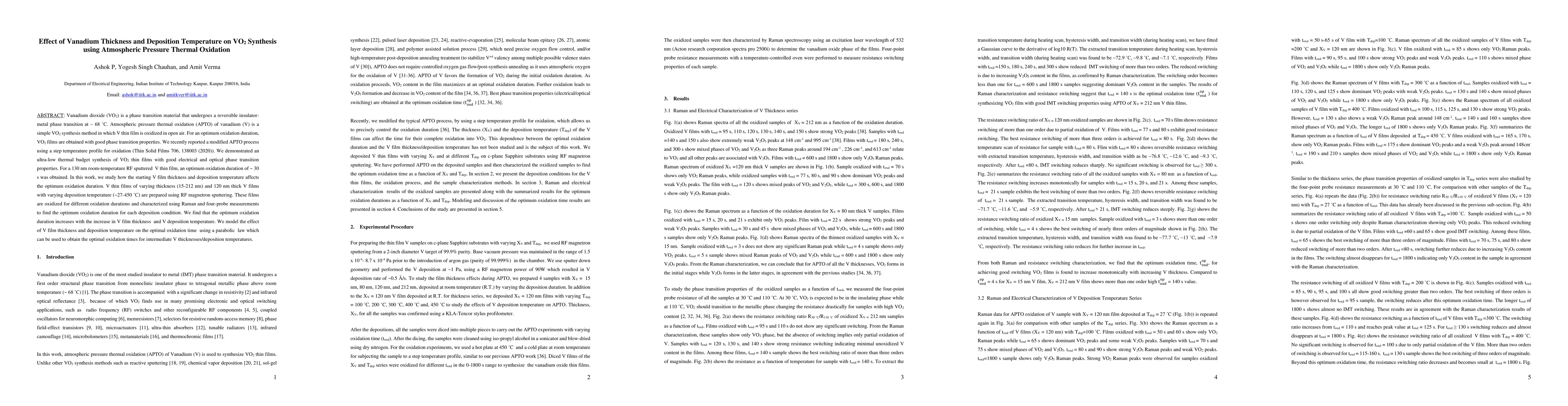 This study investigates the influence of vanadium film thickness and deposition temperature on the synthesis of vanadium dioxide (VO2) via atmospheric pressure thermal oxidation. It finds that both higher film thickness and deposition temperatures increase the optimal oxidation duration, modeled by a parabolic law for predicting optimal times.