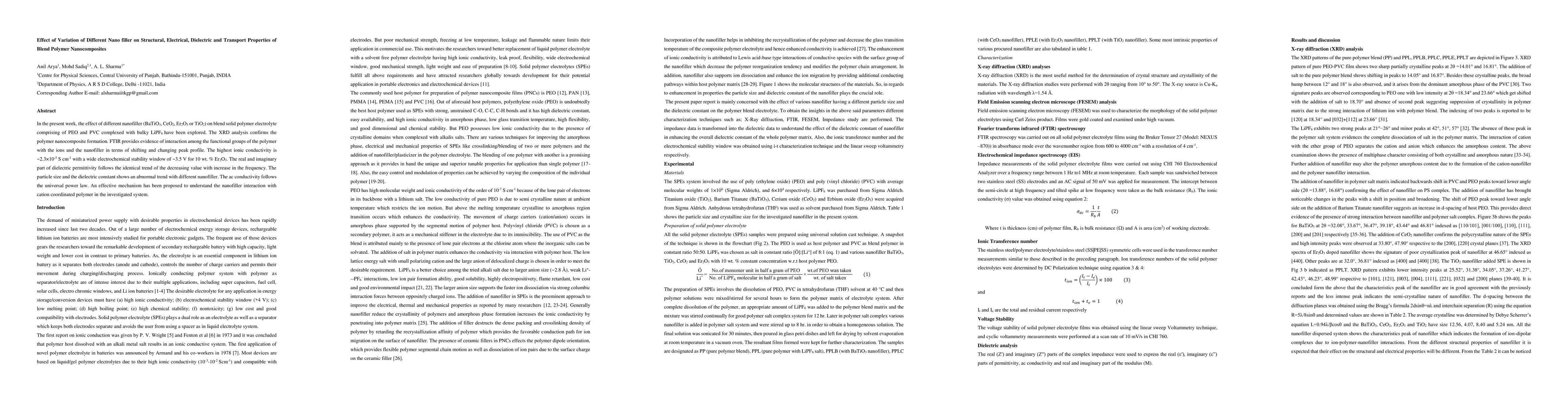 This research investigates the impact of various nanofillers (BaTiO3, CeO2, Er2O3, TiO2) on blend polymer nanocomposites, finding that Er2O3 enhances ionic conductivity to ~2.3x10-5 S cm-1 and a broad electrochemical stability window of ~3.5 V. The study employs XRD, FTIR, and dielectric analysis to observe structural, electrical, and dielectric property changes.