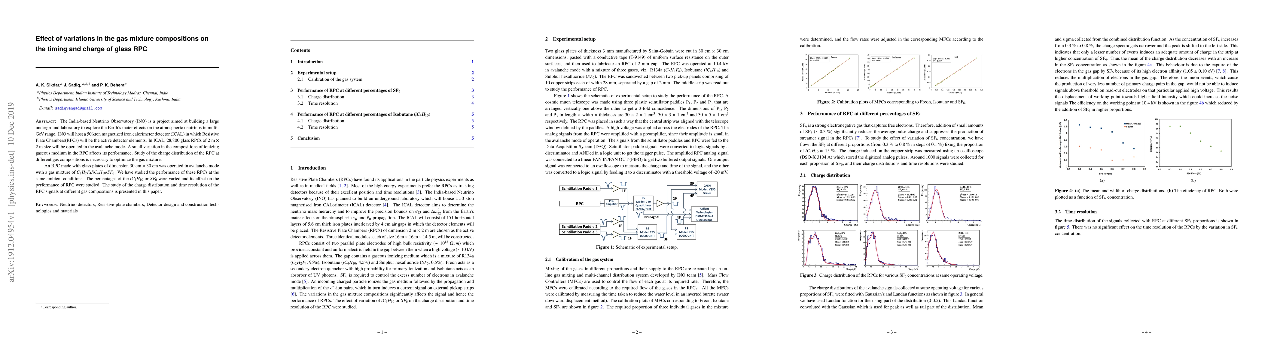 The India-based Neutrino Observatory (INO) is a project aimed at building a large underground laboratory to explore the Earth's mater effects on the atmospheric neutrinos in multi-GeV range. INO will host a 50 kton magnetized iron calorimeter detector (ICAL) in which Resistive Plate Chambers(RPCs) will be the active detector elements. In ICAL, 28,800 glass RPCs of 2 m $\times$ 2 m size will be operated in the avalanche mode. A small variation in the compositions of ionizing gaseous medium in the RPC affects its performance. Study of the charge distribution of the RPC at different gas compositions is necessary to optimize the gas mixture. An RPC made with glass plates of dimension 30 cm $\times$ 30 cm was operated in avalanche mode with a gas mixture of $C_2H_2F_4$/$iC_4H_{10}$/$SF_6$. We have studied the performance of these RPCs at the same ambient conditions. The percentages of the $iC_4H_{10}$ or $SF_6$ were varied and its effect on the performance of RPC were studied. The study of the charge distribution and time resolution of the RPC signals at different gas compositions is presented in this paper.