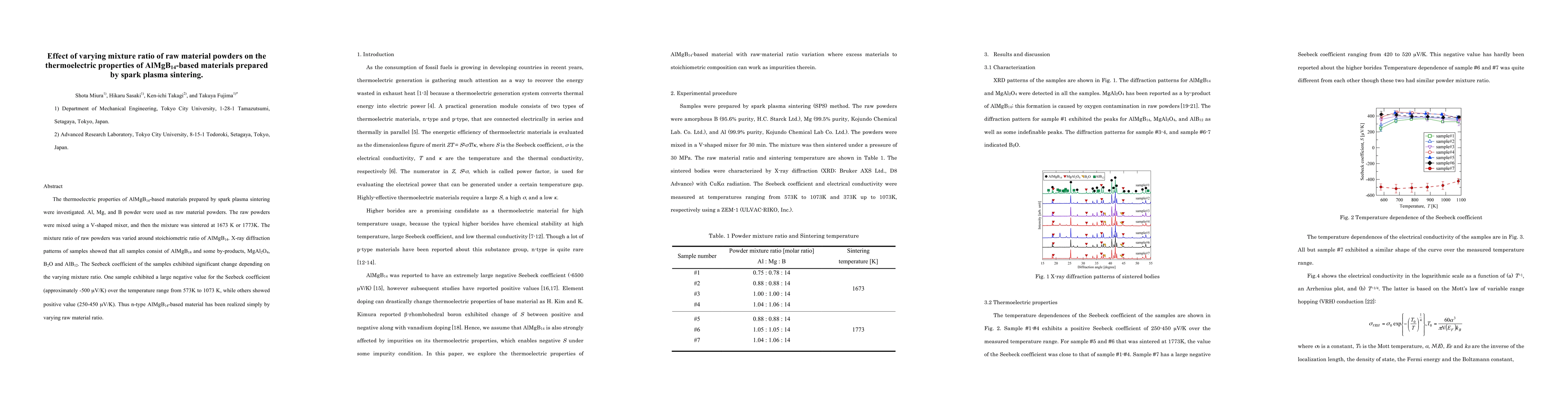 Researchers investigated how varying mixture ratios of raw materials in AlMgB14-based materials affect their thermoelectric properties after spark plasma sintering. They found that changing the ratio can create an n-type material with a negative Seebeck coefficient, enabling its use in thermoelectric applications.