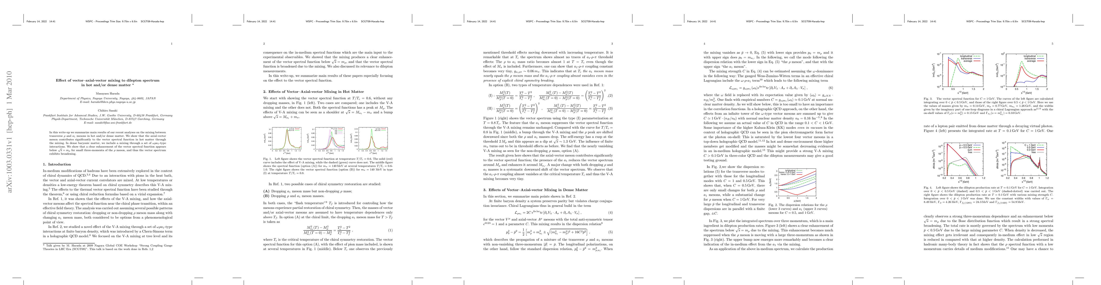 In this write-up we summarize main results of our recent analyses on the mixing between transverse rho and a1 mesons in hot and/or dense matter. We show that the axial-vector meson contributes significantly to the vector spectral function in hot matter through the mixing. In dense baryonic matter, we include a mixing through a set of omega rho a1 -type interactions. We show that a clear enhancement of the vector spectral function appears below \sqrt{s}=m_\rho for small three-momenta of the rho meson, and thus the vector spectrum exhibits broadening.