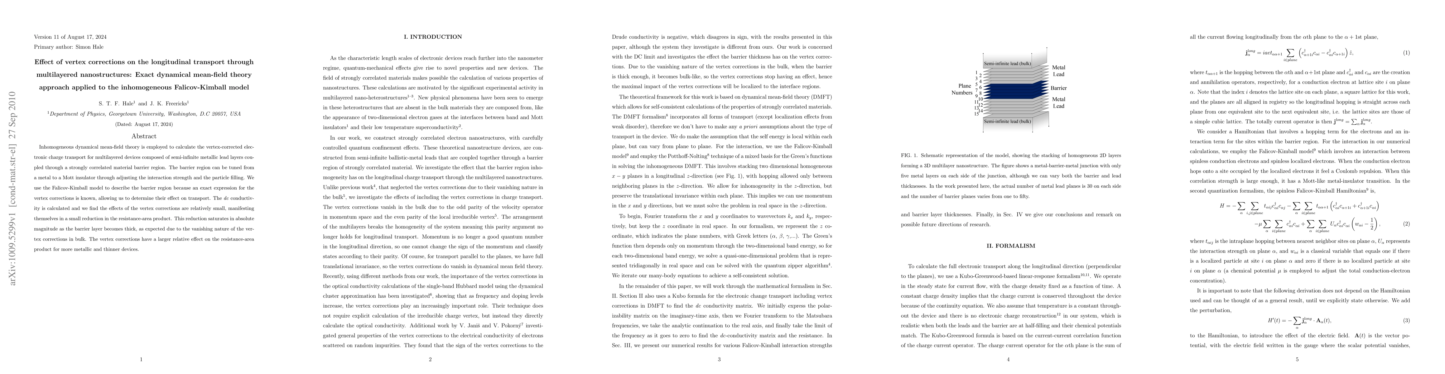 This paper employs inhomogeneous dynamical mean-field theory to study the impact of vertex corrections on electronic transport in multilayered nanostructures using the Falicov-Kimball model. The results show that vertex corrections have a small effect on the resistance-area product, which saturates with increasing barrier thickness.
