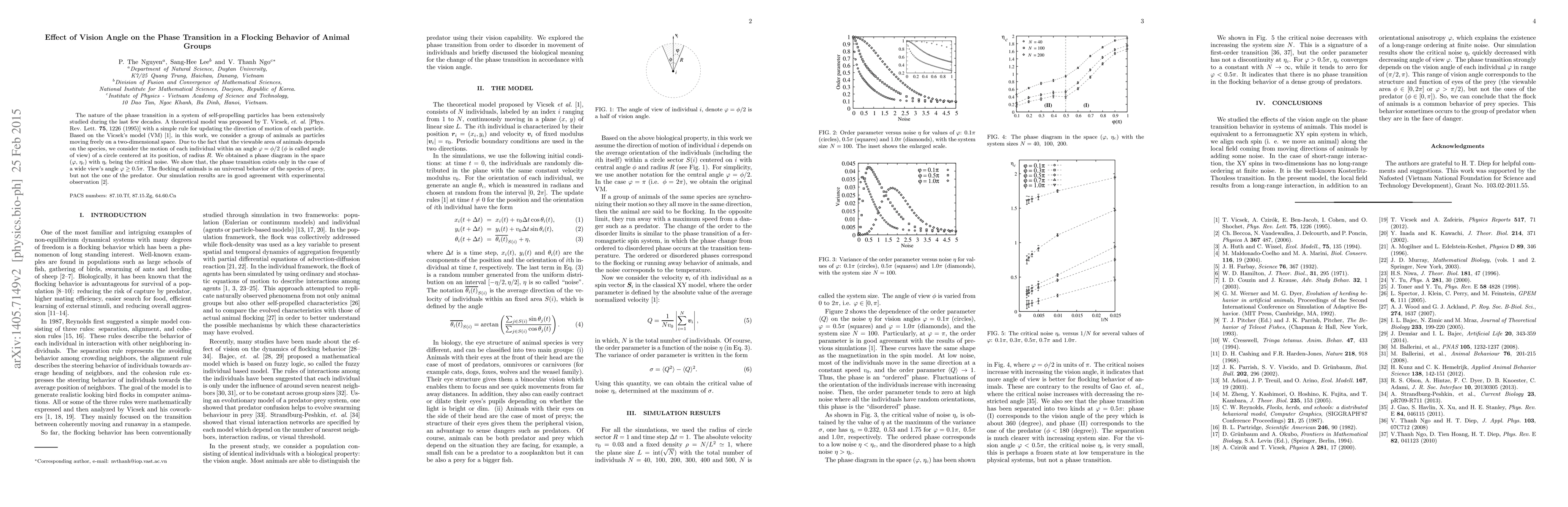 The nature of the phase transition in a system of self-propelling particles has been extensively studied during the last few decades. A theoretical model was proposed by T. Vicsek, {\it et. al.} [Phys. Rev. Lett. {\bf 75}, 1226 (1995)] with a simple rule for updating the direction of motion of each particle. Based on the Vicsek's model (VM) [1], in this work, we consider a group of animals as particles moving freely on a two-dimensional space. Due to the fact that the viewable area of animals depends on the species, we consider the motion of each individual within an angle $\varphi=\Phi/2$ ($\Phi$ is called angle of view) of a circle centered at its position, of radius $R$. We obtained a phase diagram in the space ($\varphi$, $\eta_c$) with $\eta_c$ being the critical noise. We show that, the phase transition exists only in the case of a wide view's angle $\varphi \geq 0.5\pi$. The flocking of animals is an universal behavior of the species of prey, but not the one of the predator. Our simulation results are in good agreement with experimental observation [2].
