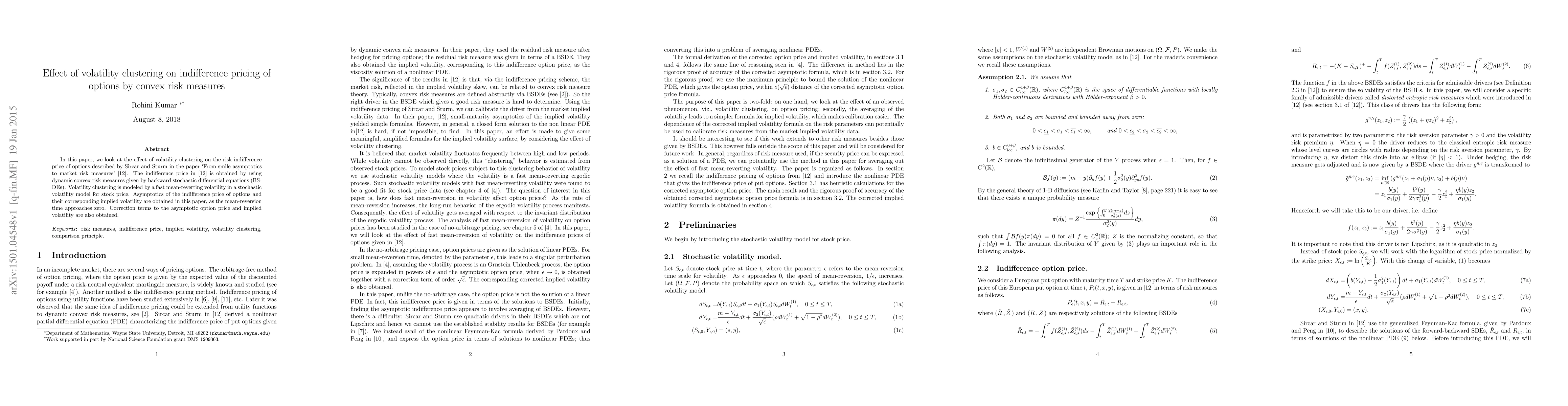 In this article, we look at the effect of volatility clustering on the risk indifference price of options described by Sircar and Sturm in their paper (Sircar, R., & Sturm, S. (2012). From smile asymptotics to market risk measures. Mathematical Finance. Advance online publication. doi:10.1111/mafi.12015). The indifference price in their article is obtained by using dynamic convex risk measures given by backward stochastic differential equations. Volatility clustering is modelled by a fast mean-reverting volatility in a stochastic volatility model for stock price. Asymptotics of the indifference price of options and their corresponding implied volatility are obtained in this article, as the mean-reversion time approaches zero. Correction terms to the asymptotic option price and implied volatility are also obtained.