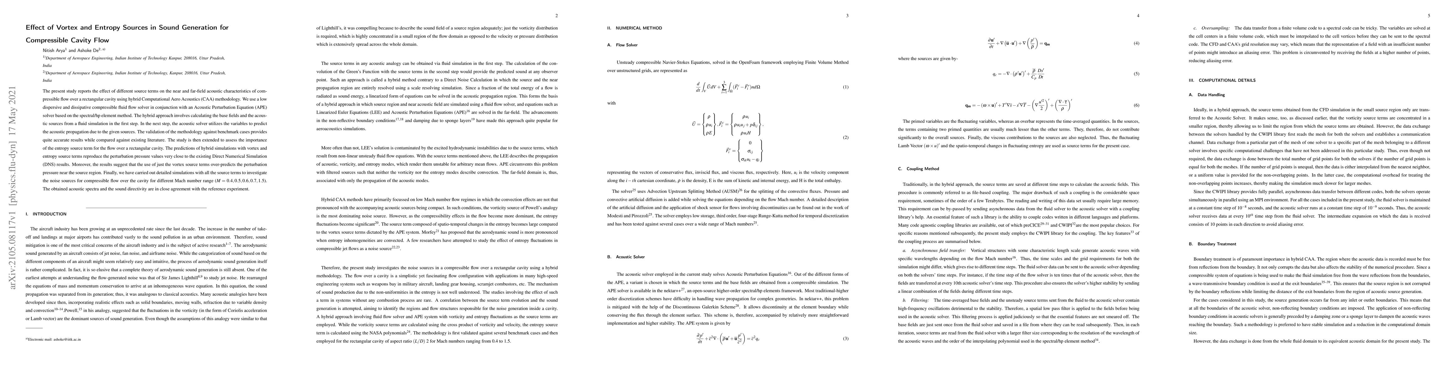 This study investigates the impact of vortex and entropy sources on acoustic characteristics in compressible cavity flow using hybrid computational aeroacoustics. The hybrid approach accurately predicts acoustic propagation, showing that vortex sources alone over-predict near-field pressure, while including entropy sources aligns closely with direct numerical simulations.