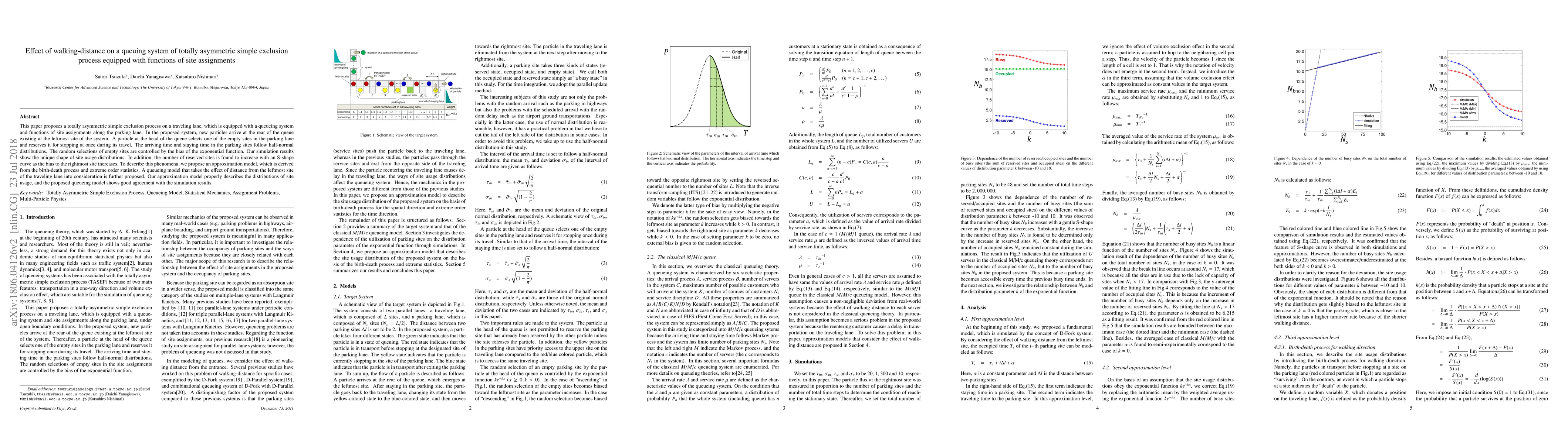 This paper proposes a totally asymmetric simple exclusion process on a traveling lane, which is equipped with a queueing system and functions of site assignments along the parking lane. In the proposed system, new particles arrive at the rear of the queue existing at the leftmost site of the system. A particle at the head of the queue selects one of the empty sites in the parking lane and reserves it for stopping at once during its travel. The arriving time and staying time in the parking sites follow half-normal distributions. The random selections of empty sites are controlled by the bias of the exponential function. Our simulation results show the unique shape of site usage distributions. In addition, the number of reserved sites is found to increase with an S-shape curve as the bias to the rightmost site increases. To describe this phenomena, we propose an approximation model, which is derived from the birth-death process and extreme order statistics. A queueing model that takes the effect of distance from the leftmost site of the traveling lane into consideration is further proposed. Our approximation model properly describes the distributions of site usage, and the proposed queueing model shows good agreement with the simulation results.