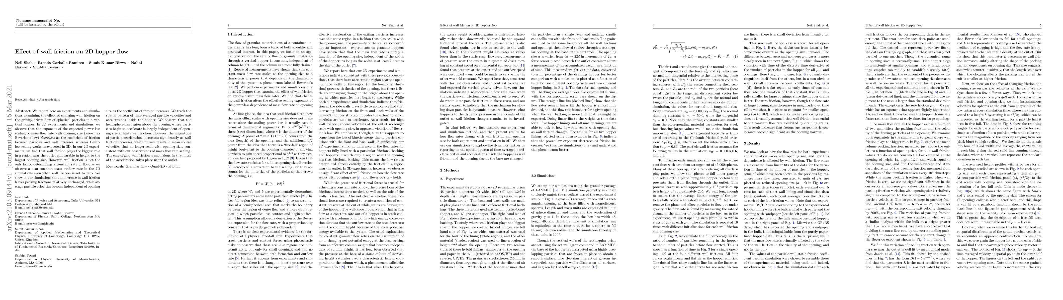 Increasing wall friction reduces the power-law scaling of mass flow rate with opening size in 2D hopper experiments, while keeping packing fractions constant, and leads to decreased particle acceleration magnitudes.