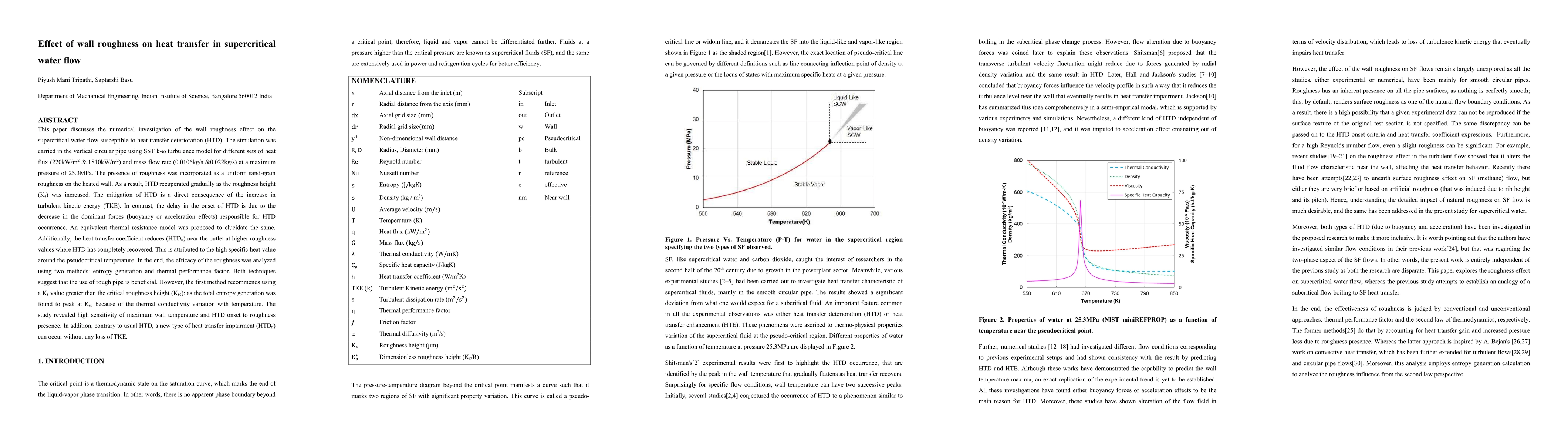 This paper discusses the numerical investigation of the wall roughness effect on the supercritical water flow susceptible to heat transfer deterioration (HTD). The simulation was carried in the vertical circular pipe using the SST k-omega turbulence model for different sets of heat flux (220kW/m2 & 1810kW/m2) and mass flow rate (0.0106kg/s &0.022kg/s) at a maximum pressure of 25.3MPa. The presence of roughness was incorporated as a uniform sand-grain roughness on the heated wall. As a result, HTD recuperated gradually as the roughness height (Ks) was increased. The mitigation of HTD is a direct consequence of the increase in turbulent kinetic energy (TKE). In contrast, the delay in the onset of HTD is due to the decrease in the dominant forces (buoyancy or acceleration effects) responsible for HTD occurrence. An equivalent thermal resistance model was proposed to elucidate the same. Additionally, the heat transfer coefficient reduces (HTDn) near the outlet at higher roughness values where HTD has completely recovered. This is attributed to the high specific heat value around the pseudocritical temperature. In the end, the efficacy of the roughness was analyzed using two methods: entropy generation and thermal performance factor. Both techniques suggest that the use of rough pipe is beneficial. However, the first method recommends using a Ks value greater than the critical roughness height (Ksc): as the total entropy generation was found to peak at Ksc because of the thermal conductivity variation with temperature. The study revealed high sensitivity of maximum wall temperature and HTD onset to roughness presence. In addition, contrary to usual HTD, a new type of heat transfer impairment (HTDn) can occur without any loss of TKE.