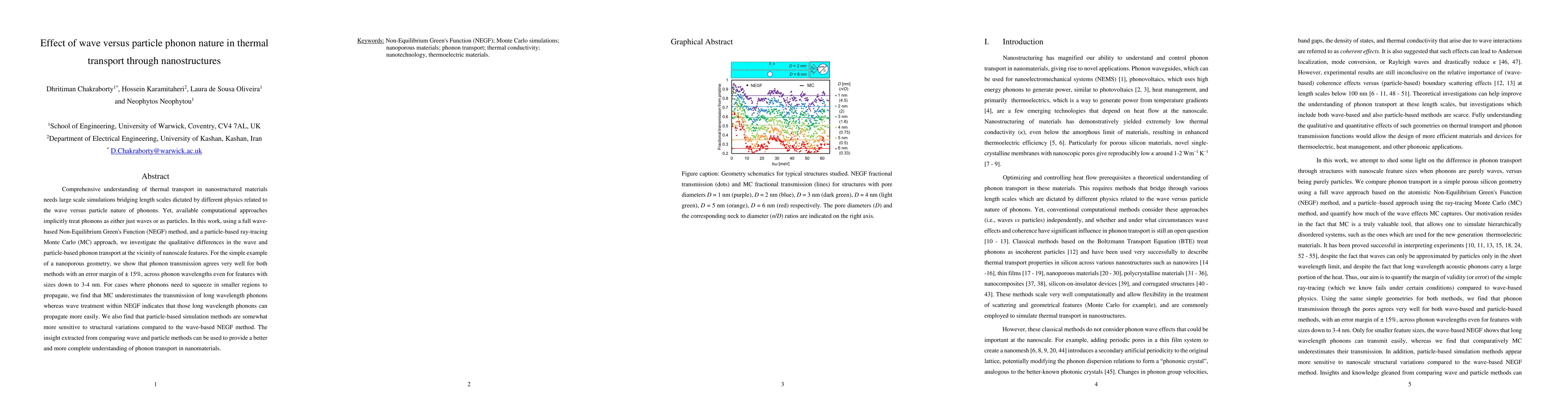 Comprehensive understanding of thermal transport in nanostructured materials needs large scale simulations bridging length scales dictated by different physics related to the wave versus particle nature of phonons. Yet, available computational approaches implicitly treat phonons as either just waves or as particles. In this work, using a full wave-based Non-Equilibrium Green's Function (NEGF) method, and a particle-based ray-tracing Monte Carlo (MC) approach, we investigate the qualitative differences in the wave and particle-based phonon transport at the vicinity of nanoscale features. For the simple example of a nanoporous geometry, we show that phonon transmission agrees very well for both methods with an error margin of approximately 15%, across phonon wavelengths even for features with sizes down to 3-4 nm. For cases where phonons need to squeeze in smaller regions to propagate, we find that MC underestimates the transmission of long wavelength phonons whereas wave treatment within NEGF indicates that those long wavelength phonons can propagate more easily. We also find that particle-based simulation methods are somewhat more sensitive to structural variations compared to the wave-based NEGF method. The insight extracted from comparing wave and particle methods can be used to provide a better and more complete understanding of phonon transport in nanomaterials.