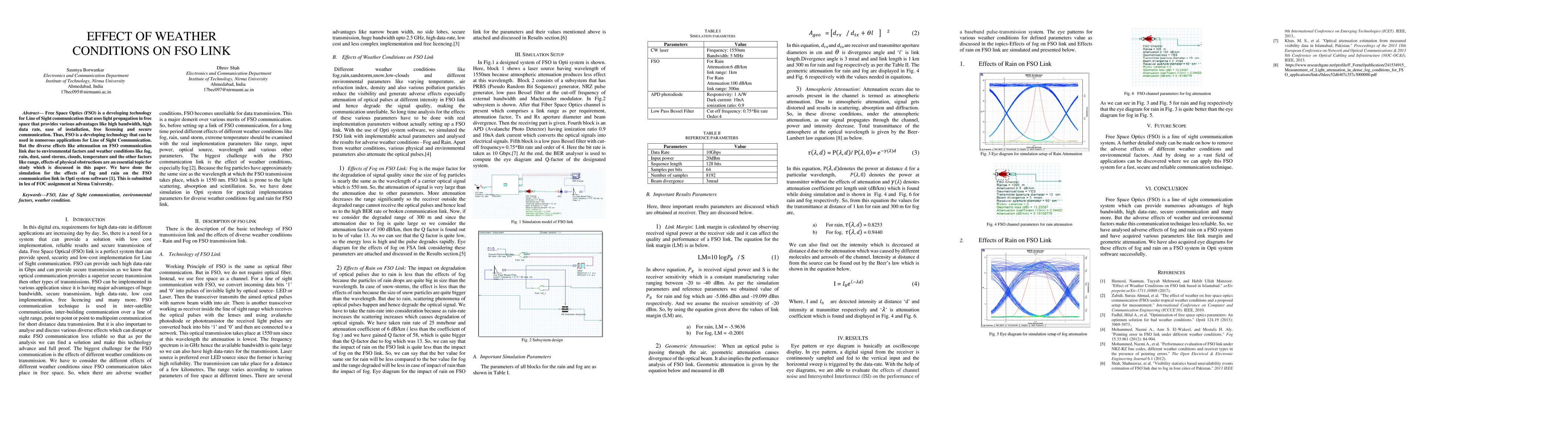Free Space Optics (FSO) is a developing technology for Line of Sight communication that uses light propagation in free space that provides various advantages like high bandwidth, high data rate, ease of installation, free licensing and secure communication. Thus, FSO is a developing technology that can be used in numerous applications for Line of Sight Communication. But the diverse effects like attenuation on FSO communication link due to environmental factors and weather conditions like fog, rain, dust, sand storms, clouds, temperature and the other factors like range, effects of physical obstructions are an essential topic for study which is discussed in this paper. We have done the simulation for the effects of fog and rain on the FSO communication link in Opti system software [1]. This is submitted in leu of FOC assignment at Nirma University.