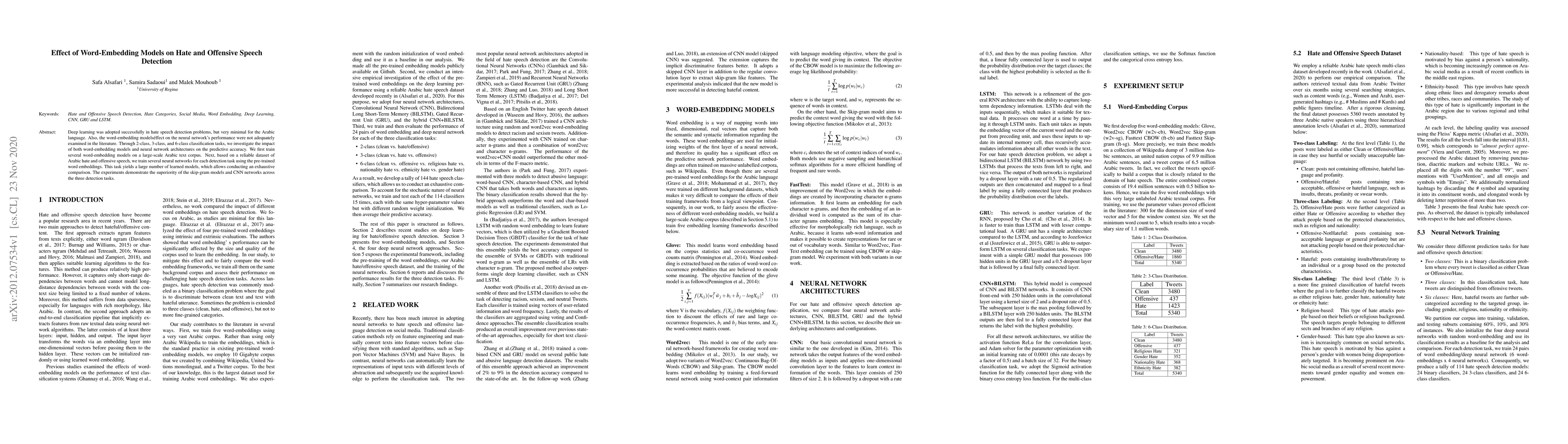 This study investigates how different word embedding models and neural network architectures impact the detection of hate and offensive speech in Arabic. The results show that skip-gram models and CNN networks outperform others in various classification tasks, highlighting the importance of both embedding and architecture choices in neural network performance.