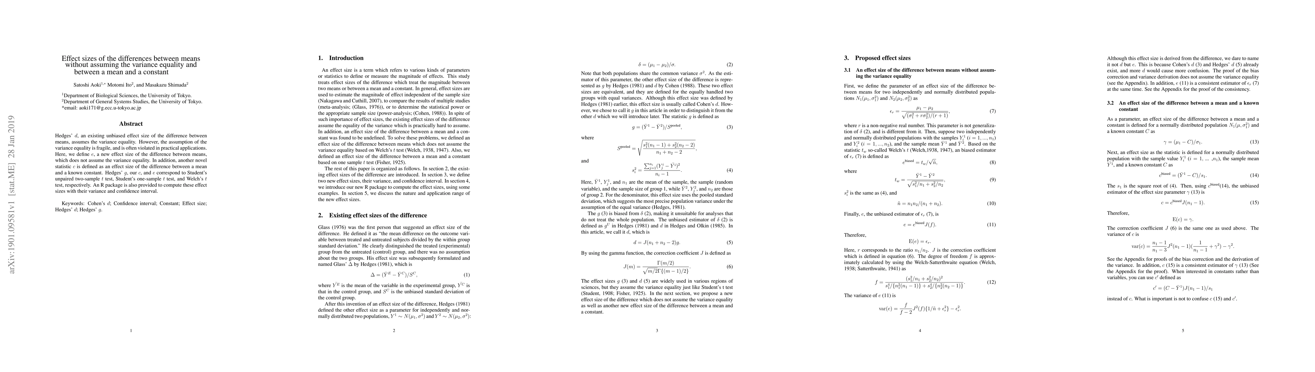 Hedges' d, an existing unbiased effect size of the difference between means, assumes the variance equality. However, the assumption of the variance equality is fragile, and is often violated in practical applications. Here, we define e, a new effect size of the difference between means, which does not assume the variance equality. In addition, another novel statistic c is defined as an effect size of the difference between a mean and a known constant. Hedges' g, our c, and e correspond to Student's unpaired two-sample t test, Student's one-sample t test, and Welch's t test, respectively. An R package is also provided to compute these effect sizes with their variance and confidence interval.