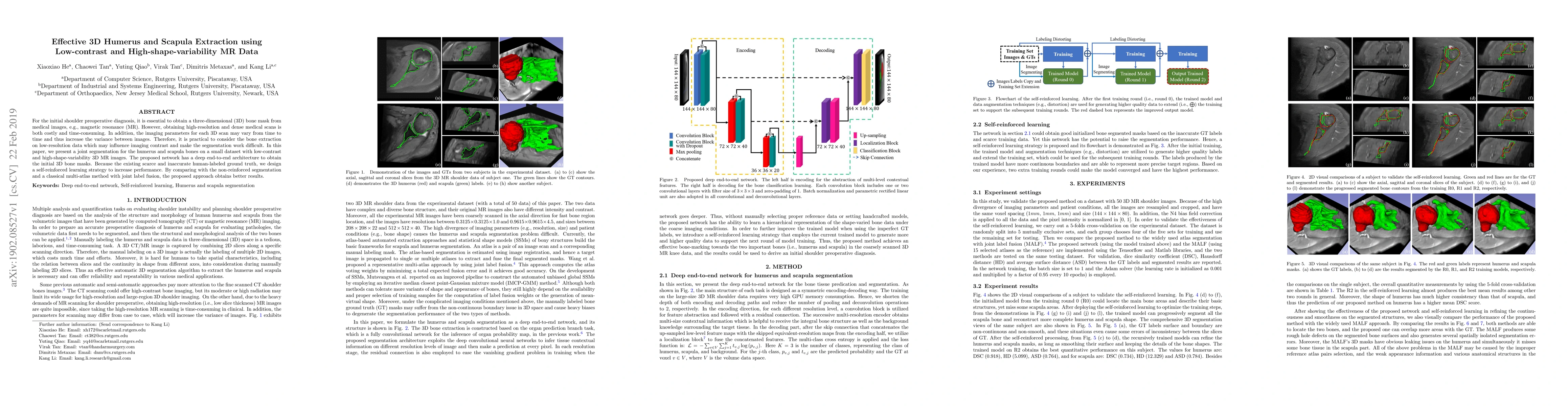 For the initial shoulder preoperative diagnosis, it is essential to obtain a three-dimensional (3D) bone mask from medical images, e.g., magnetic resonance (MR). However, obtaining high-resolution and dense medical scans is both costly and time-consuming. In addition, the imaging parameters for each 3D scan may vary from time to time and thus increase the variance between images. Therefore, it is practical to consider the bone extraction on low-resolution data which may influence imaging contrast and make the segmentation work difficult. In this paper, we present a joint segmentation for the humerus and scapula bones on a small dataset with low-contrast and high-shape-variability 3D MR images. The proposed network has a deep end-to-end architecture to obtain the initial 3D bone masks. Because the existing scarce and inaccurate human-labeled ground truth, we design a self-reinforced learning strategy to increase performance. By comparing with the non-reinforced segmentation and a classical multi-atlas method with joint label fusion, the proposed approach obtains better results.