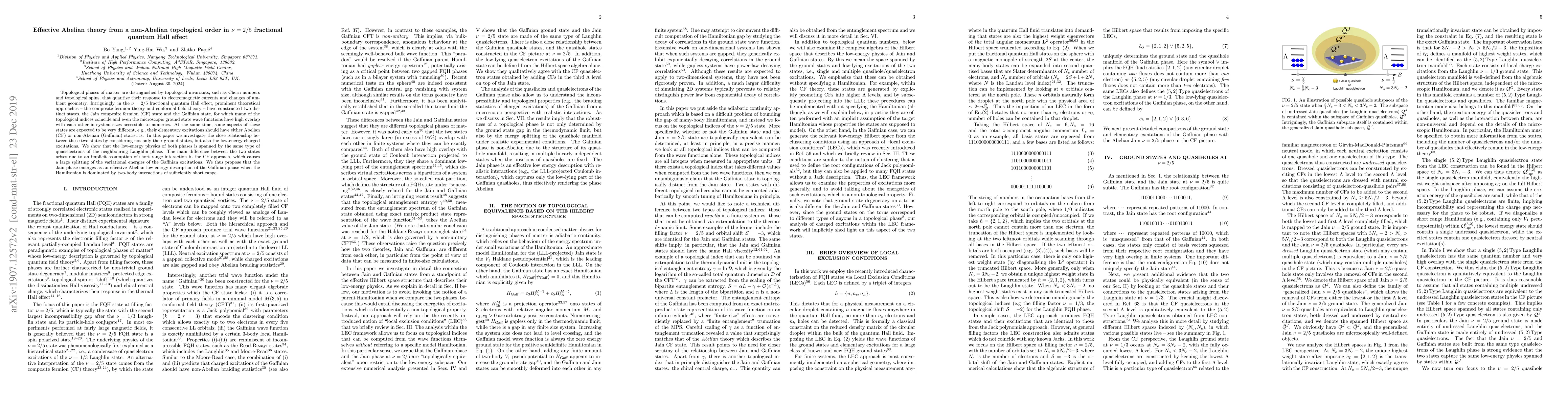 Topological phases of matter are distinguished by topological invariants, such as Chern numbers and topological spins, that quantize their response to electromagnetic currents and changes of ambient geometry. Intriguingly, in the $\nu=2/5$ fractional quantum Hall effect, prominent theoretical approaches -- the composite fermion theory and conformal field theory -- have constructed two distinct states, the Jain composite fermion (CF) state and the Gaffnian state, for which many of the topological indices coincide and even the microscopic ground state wave functions have high overlap with each other in system sizes accessible to numerics. At the same time, some aspects of these states are expected to be very different, e.g., their elementary excitations should have either Abelian (CF) or non-Abelian (Gaffnian) statistics. In this paper we investigate the close relationship between these two states by considering not only their ground states, but also the low-energy charged excitations. We show that the low-energy physics of both phases is spanned by the same type of quasielectrons of the neighbouring Laughlin phase. The main difference between the two states arises due to an implicit assumption of short-range interaction in the CF approach, which causes a large splitting of the variational energies of the Gaffnian excitations. We thus propose that the Jain phase emerges as an effective Abelian low-energy description of the Gaffnian phase when the Hamiltonian is dominated by two-body interactions of sufficiently short range.
