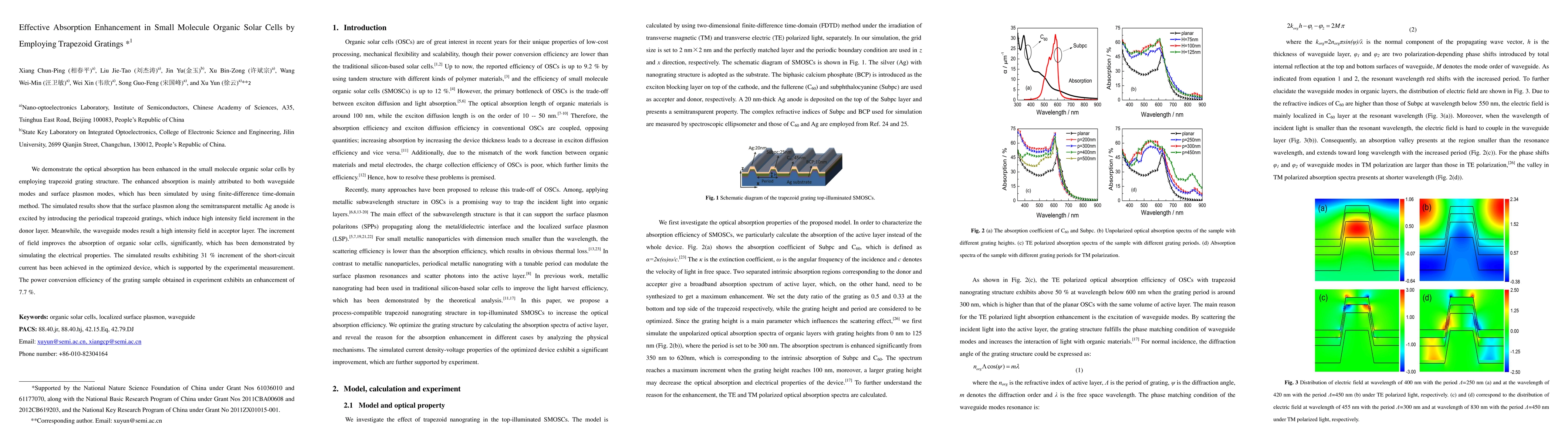 We demonstrate the optical absorption has been enhanced in the small molecule organic solar cells by employing trapezoid grating structure. The enhanced absorption is mainly attributed to both waveguide modes and surface plasmon modes, which has been simulated by using finite-difference time-domain method. The simulated results show that the surface plasmon along the semitransparent metallic Ag anode is excited by introducing the periodical trapezoid gratings, which induce high intensity field increment in the donor layer. Meanwhile, the waveguide modes result a high intensity field in acceptor layer. The increment of field improves the absorption of organic solar cells, significantly, which has been demonstrated by simulating the electrical properties. The simulated results exhibiting 31 % increment of the short-circuit current has been achieved in the optimized device, which is supported by the experimental measurement. The power conversion efficiency of the grating sample obtained in experiment exhibits an enhancement of 7.7 %.