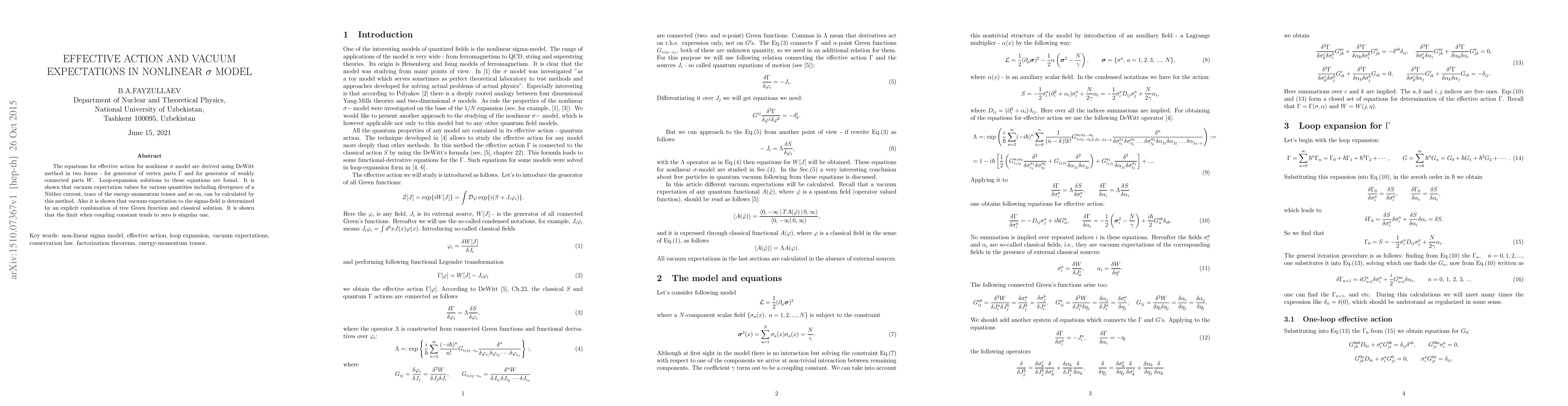 This paper derives the effective action for a nonlinear $\sigma$ model using the DeWitt method, finding loop-expansion solutions for both vertex and weakly connected parts. It demonstrates the calculation of vacuum expectation values for various quantities and shows that the sigma-field's vacuum expectation is determined by a combination of tree Green functions and classical solutions, with a singular limit as the coupling constant approaches zero.