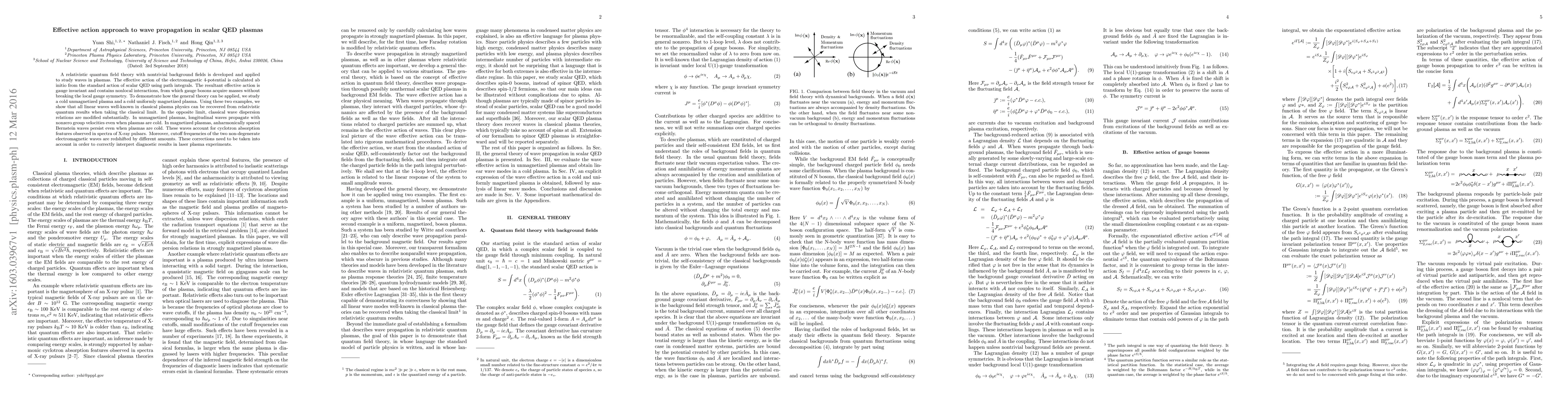 A relativistic quantum field theory with nontrivial background fields is developed and applied to study waves in plasmas. The effective action of the electromagnetic 4-potential is calculated ab initio from the standard action of scalar QED using path integrals. The resultant effective action is gauge invariant and contains nonlocal interactions, from which gauge bosons acquire masses without breaking the local gauge symmetry. To demonstrate how the general theory can be applied, we study a cold unmagnetized plasma and a cold uniformly magnetized plasma. Using these two examples, we show that all linear waves well-known in classical plasma physics can be recovered from relativistic quantum results when taking the classical limit. In the opposite limit, classical wave dispersion relations are modified substantially. In unmagnetized plasmas, longitudinal waves propagate with nonzero group velocities even when plasmas are cold. In magnetized plasmas, anharmonically spaced Bernstein waves persist even when plasmas are cold. These waves account for cyclotron absorption features observed in spectra of X-ray pulsars. Moreover, cutoff frequencies of the two non-degenerate electromagnetic waves are redshifted by different amounts. These corrections need to be taken into account in order to correctly interpret diagnostic results in laser plasma experiments.