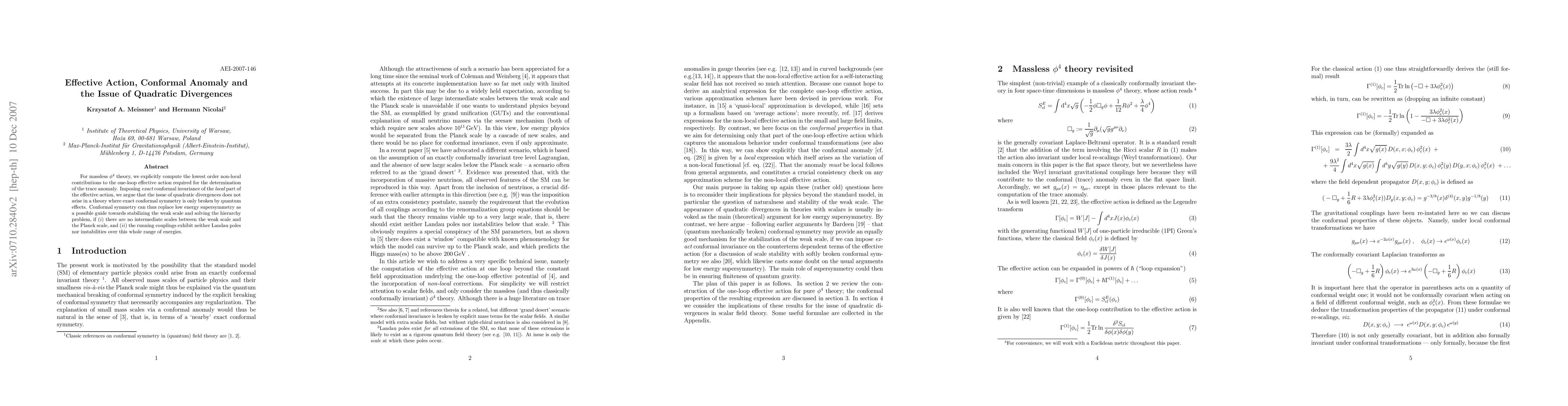 For massless $\phi^4$ theory, we explicitly compute the lowest order non-local contributions to the one-loop effective action required for the determination of the trace anomaly. Imposing exact conformal invariance of the local part of the effective action, we argue that the issue of quadratic divergences does not arise in a theory where exact conformal symmetry is only broken by quantum effects. Conformal symmetry can thus replace low energy supersymmetry as a possible guide towards stabilizing the weak scale and solving the hierarchy problem, if (i) there are no intermediate scales between the weak scale and the Planck scale, and (ii) the running couplings exhibit neither Landau poles nor instabilities over this whole range of energies.