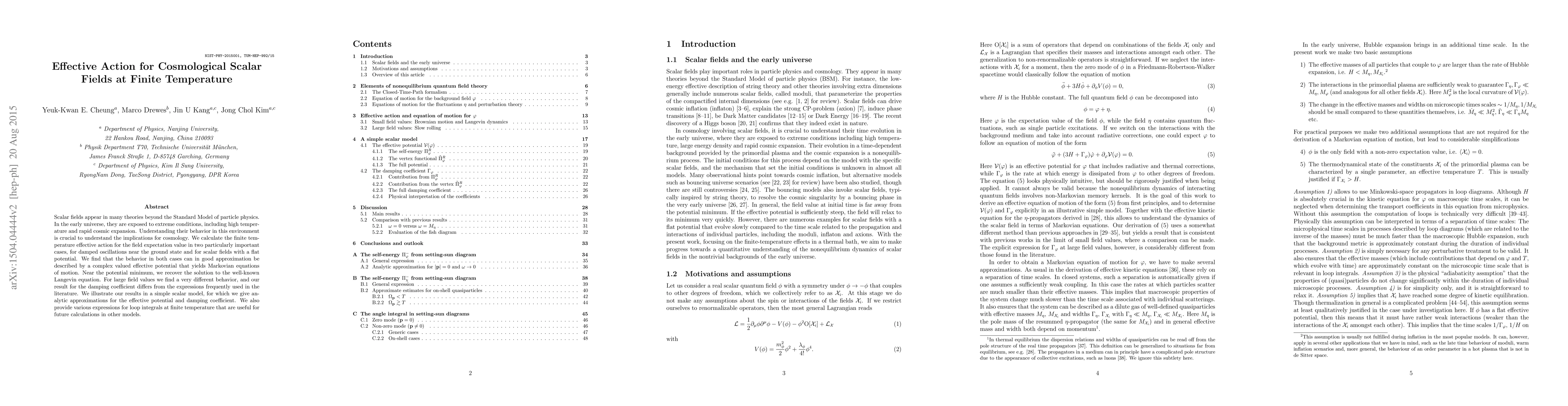 Scalar fields appear in many theories beyond the Standard Model of particle physics. In the early universe, they are exposed to extreme conditions, including high temperature and rapid cosmic expansion. Understanding their behavior in this environment is crucial to understand the implications for cosmology. We calculate the finite temperature effective action for the field expectation value in two particularly important cases, for damped oscillations near the ground state and for scalar fields with a flat potential. We find that the behavior in both cases can in good approximation be described by a complex valued effective potential that yields Markovian equations of motion. Near the potential minimum, we recover the solution to the well-known Langevin equation. For large field values we find a very different behavior, and our result for the damping coefficient differs from the expressions frequently used in the literature. We illustrate our results in a simple scalar model, for which we give analytic approximations for the effective potential and damping coefficient. We also provide various expressions for loop integrals at finite temperature that are useful for future calculations in other models.