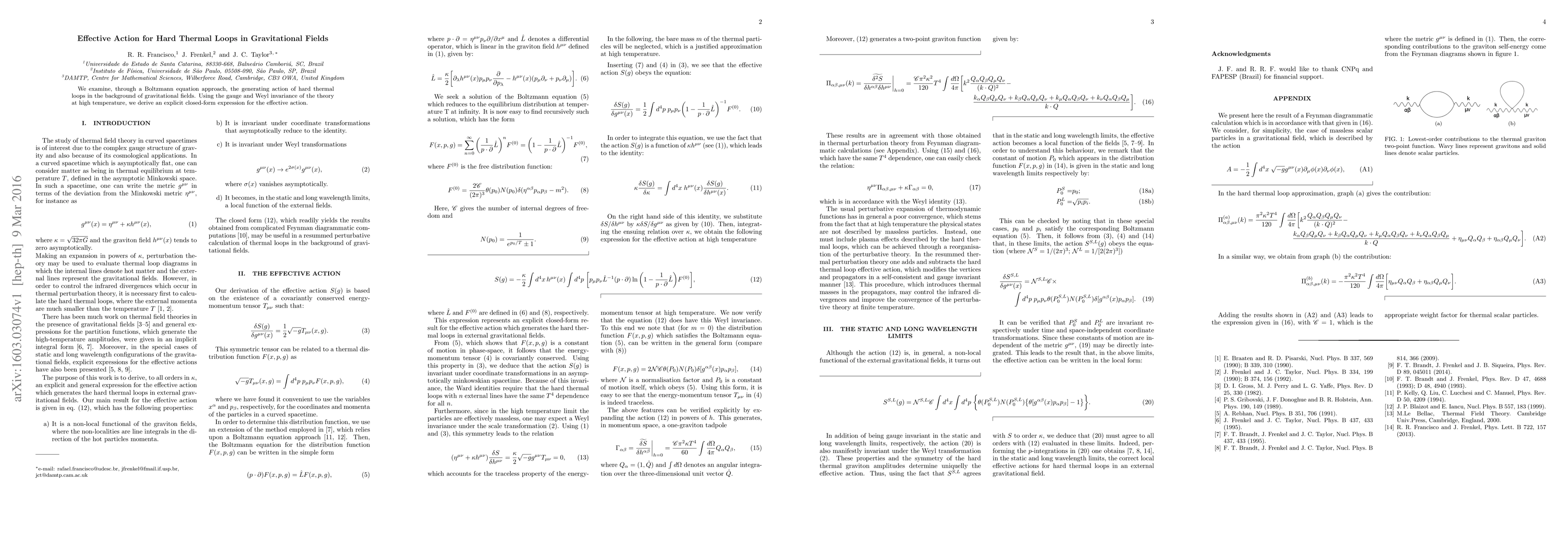 This paper develops an effective action for hard thermal loops in gravitational fields via a Boltzmann equation approach, deriving a closed-form expression that respects gauge and Weyl invariance at high temperatures.