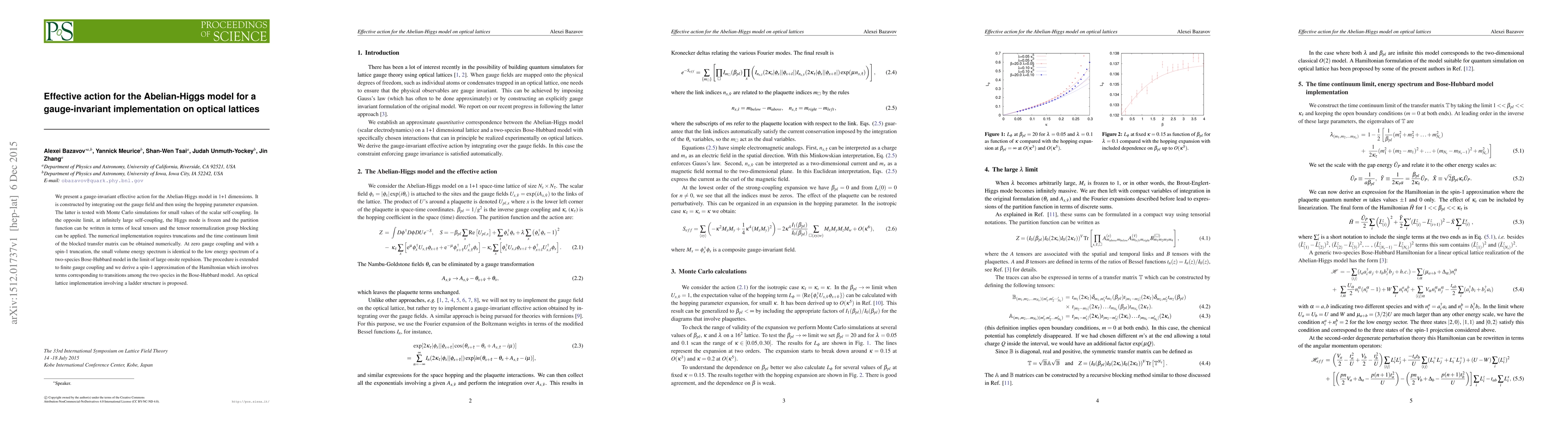 We present a gauge-invariant effective action for the Abelian-Higgs model in 1+1 dimensions. It is constructed by integrating out the gauge field and then using the hopping parameter expansion. The latter is tested with Monte Carlo simulations for small values of the scalar self-coupling. In the opposite limit, at infinitely large self-coupling, the Higgs mode is frozen and the partition function can be written in terms of local tensors and the tensor renormalization group blocking can be applied. The numerical implementation requires truncations and the time continuum limit of the blocked transfer matrix can be obtained numerically. At zero gauge coupling and with a spin-1 truncation, the small volume energy spectrum is identical to the low energy spectrum of a two-species Bose-Hubbard model in the limit of large onsite repulsion. The procedure is extended to finite gauge coupling and we derive a spin-1 approximation of the Hamiltonian which involves terms corresponding to transitions among the two species in the Bose-Hubbard model. An optical lattice implementation involving a ladder structure is proposed.