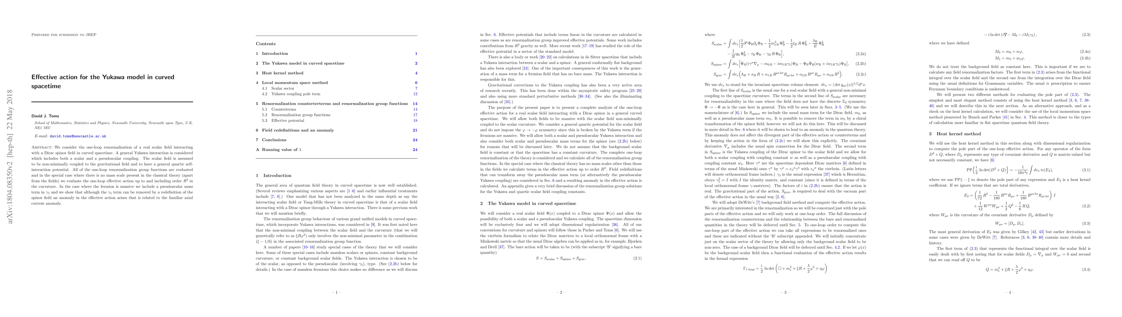 This paper evaluates the one-loop renormalization of a Yukawa interaction in curved spacetime, considering both scalar and pseudoscalar couplings. It computes the one-loop effective action up to $R^2$ order, revealing an anomaly related to the axial current anomaly in the presence of a massive fermion.