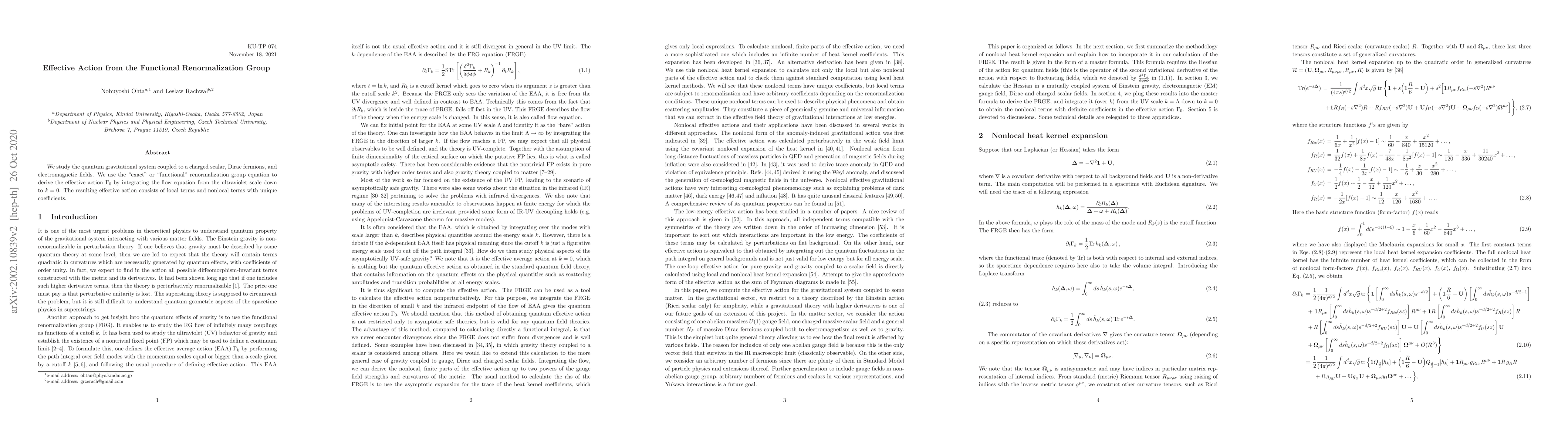 This paper employs the functional renormalization group to derive an effective action $\Gamma_0$ for quantum gravity coupled with charged scalars, Dirac fermions, and electromagnetic fields, revealing both local and nonlocal terms with distinct coefficients.