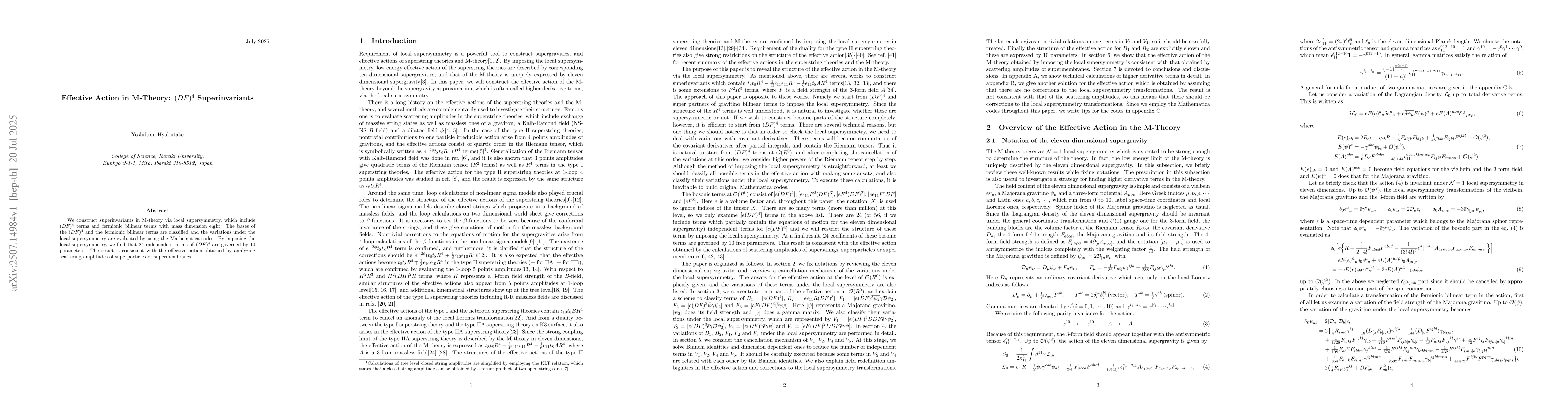 We construct superinvariants in M-theory via local supersymmetry, which include $(DF)^4$ terms and fermionic bilinear terms with mass dimension eight. The bases of the $(DF)^4$ and the fermionic bilinear terms are classified and the variations under the local supersymmetry are evaluated by using the Mathematica codes. By imposing the local supersymmetry, we find that 24 independent terms of $(DF)^4$ are governed by 10 parameters. The result is consistent with the effective action obtained by analyzing scattering amplitudes of superparticles or supermembranes.