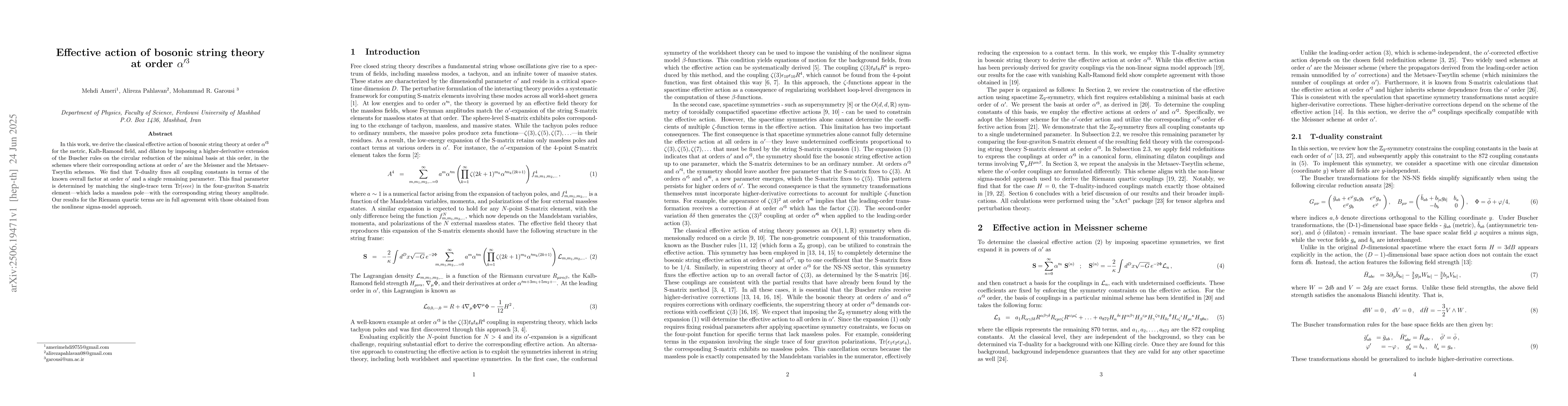 In this work, we derive the classical effective action of bosonic string theory at order $\alpha'^{3}$ for the metric, Kalb-Ramond field, and dilaton by imposing a higher-derivative extension of the Buscher rules on the circular reduction of the minimal basis at this order, in the schemes where their corresponding actions at order $\alpha'$ are the Meissner and the Metsaev-Tseytlin schemes. We find that T-duality fixes all coupling constants in terms of the known overall factor at order $\alpha'$ and a single remaining parameter. This final parameter is determined by matching the single-trace term $\Tr(\epsilon \epsilon \epsilon \epsilon)$ in the four-graviton S-matrix element which lacks a massless pole, with the corresponding string theory amplitude. Our results for the Riemann quartic terms are in full agreement with those obtained from the nonlinear sigma-model approach.