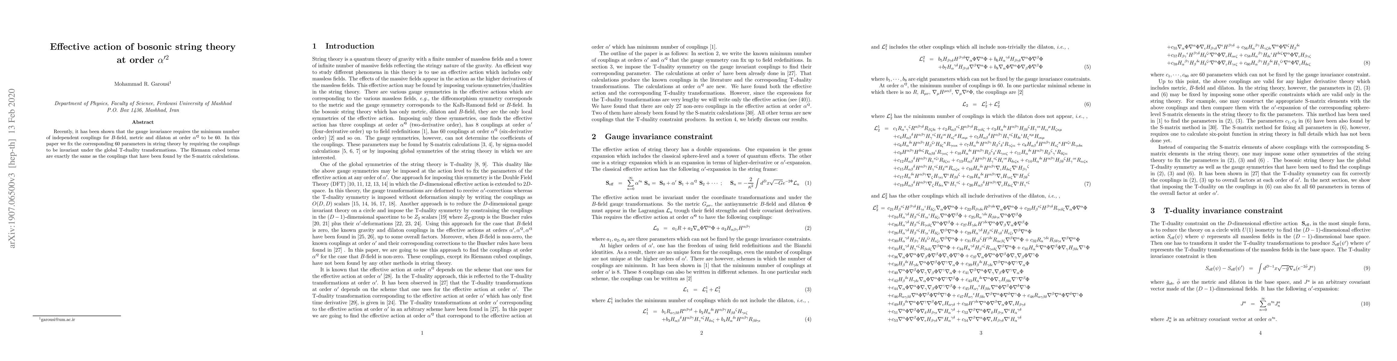 This paper determines the 60 independent couplings in bosonic string theory at order $\alpha'^2$ by enforcing invariance under global T-duality, aligning these couplings with those derived from S-matrix calculations. The focus is on ensuring gauge invariance and consistency with theoretical predictions.