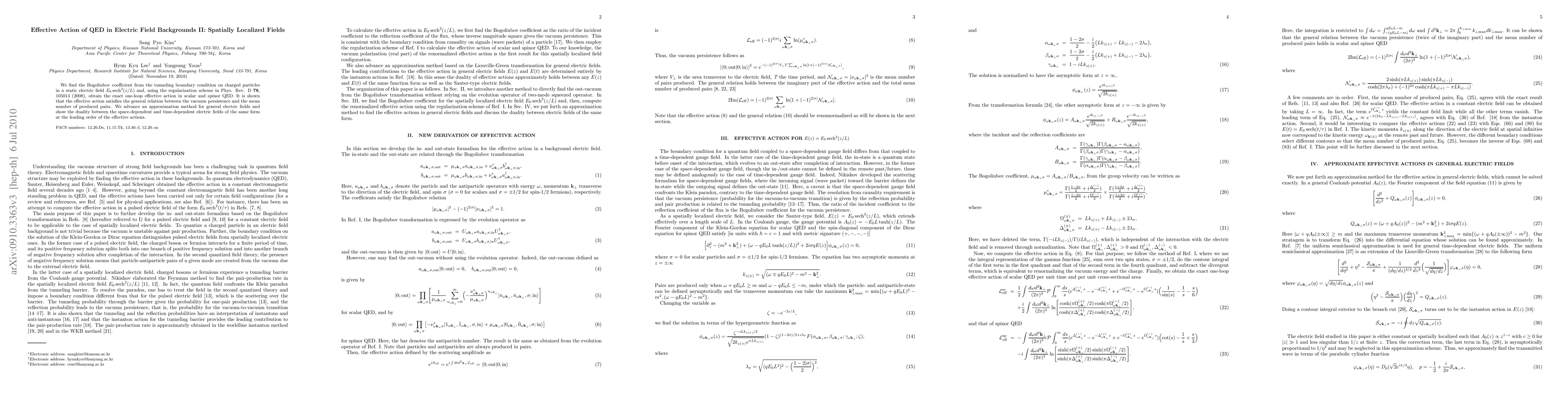 This paper derives the Bogoliubov coefficient for a charged particle in a spatially localized electric field and computes the exact one-loop effective action in scalar and spinor QED. It also establishes the duality between spatially and temporally varying electric fields and verifies the relation between vacuum persistence and pair production.